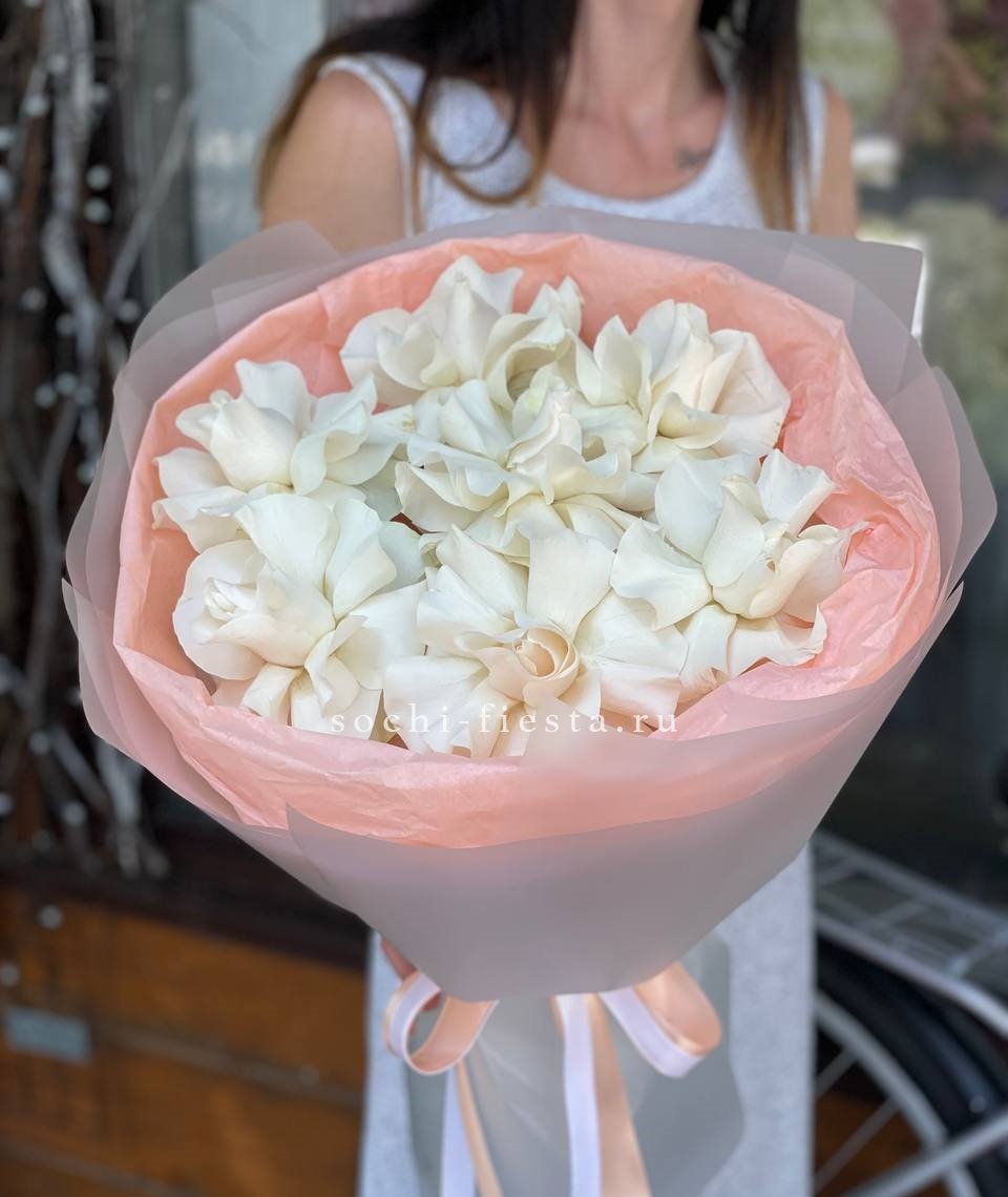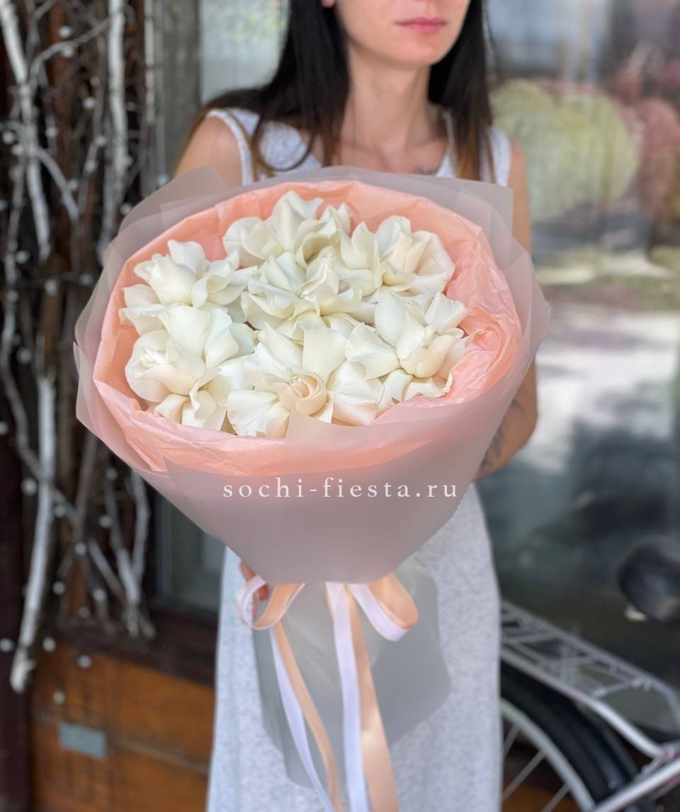 Классический букет из пятнадцати белых роз в упаковке из фоамирана держит форму и остается свежим долгое время. Компактная композиция удобна для транспортировки и размещения в любом интерьере.