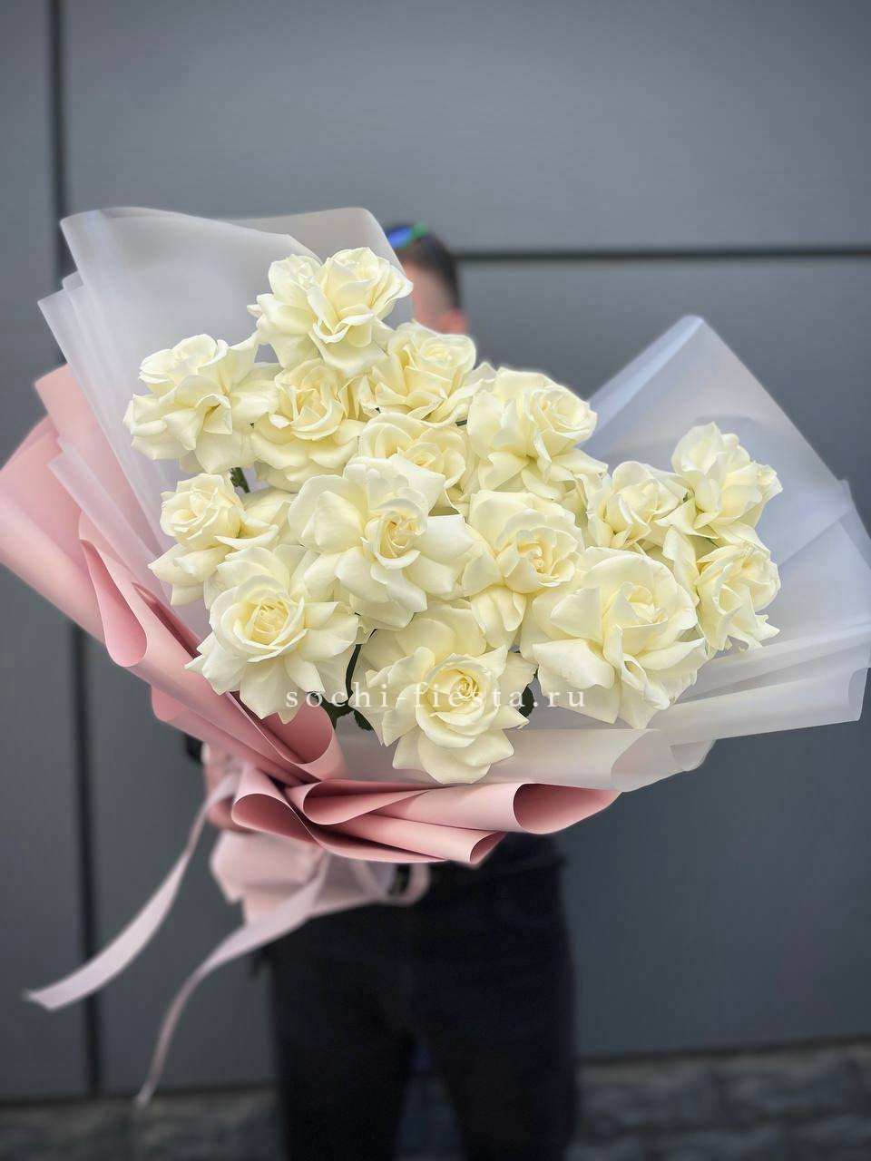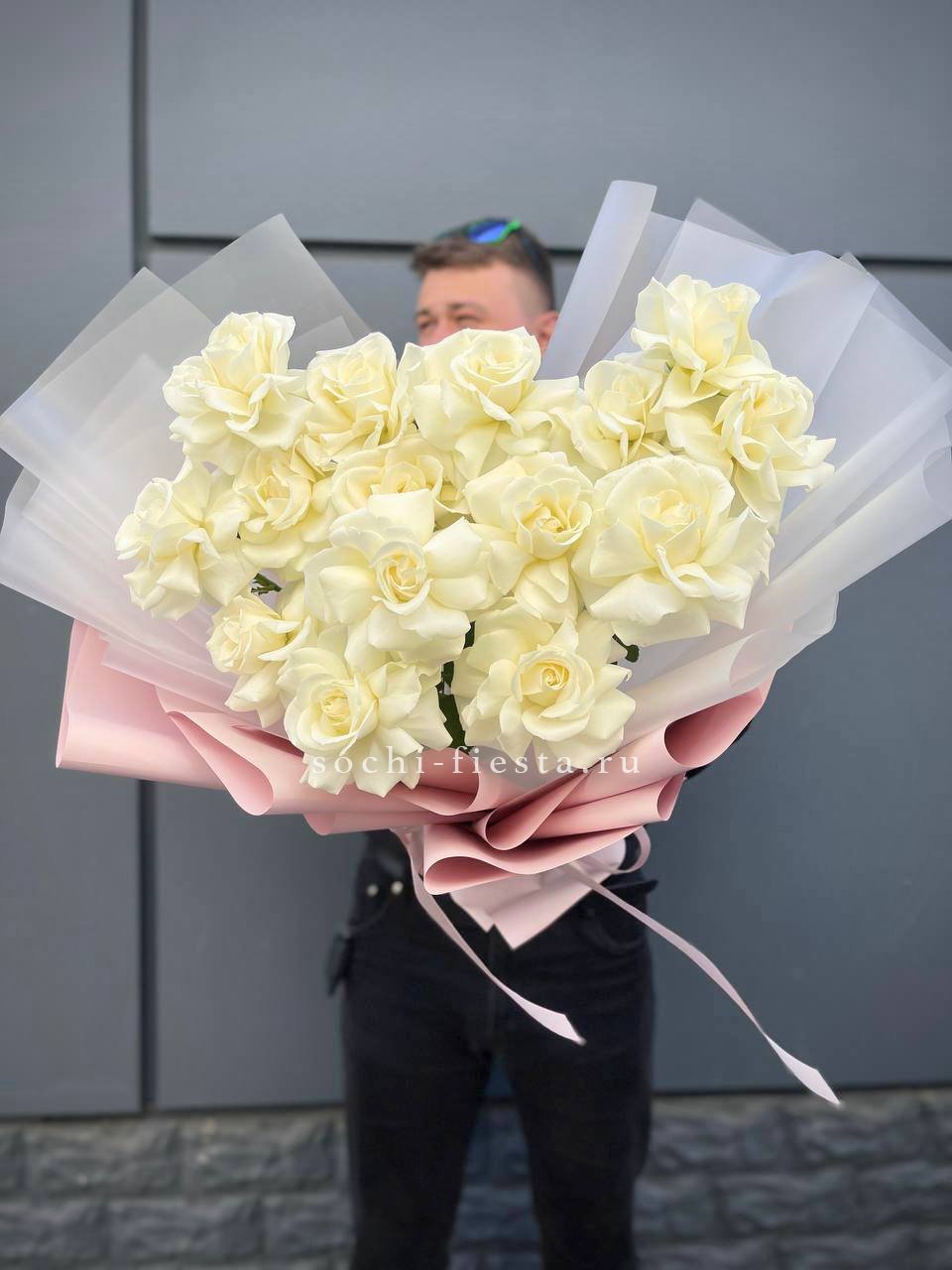 Пятнадцать вывернутых роз White Dream раскрываются широкими головками с волнистыми лепестками. Белый цвет переливается от молочного до холодного снежного оттенка.