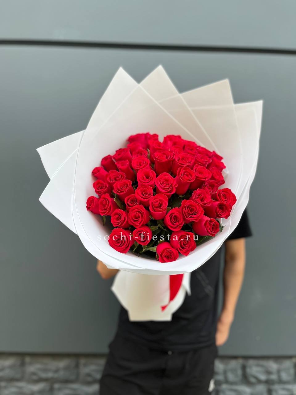 Красные розы в количестве девятнадцати стеблей, оформленные в матовую крафт-бумагу. Минималистичная обертка не отвлекает от насыщенного цвета и упругих бутонов. Простое решение с четким характером.