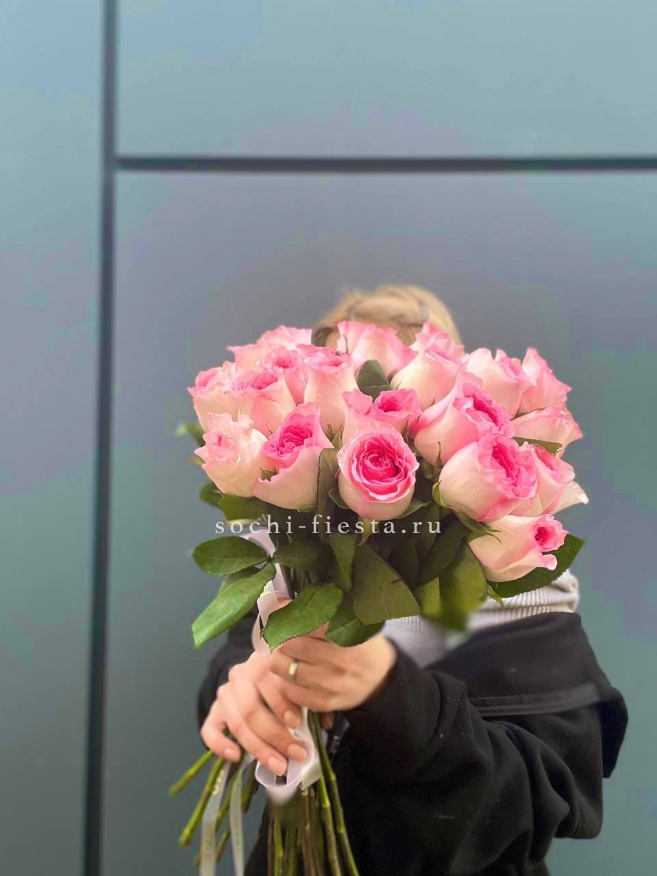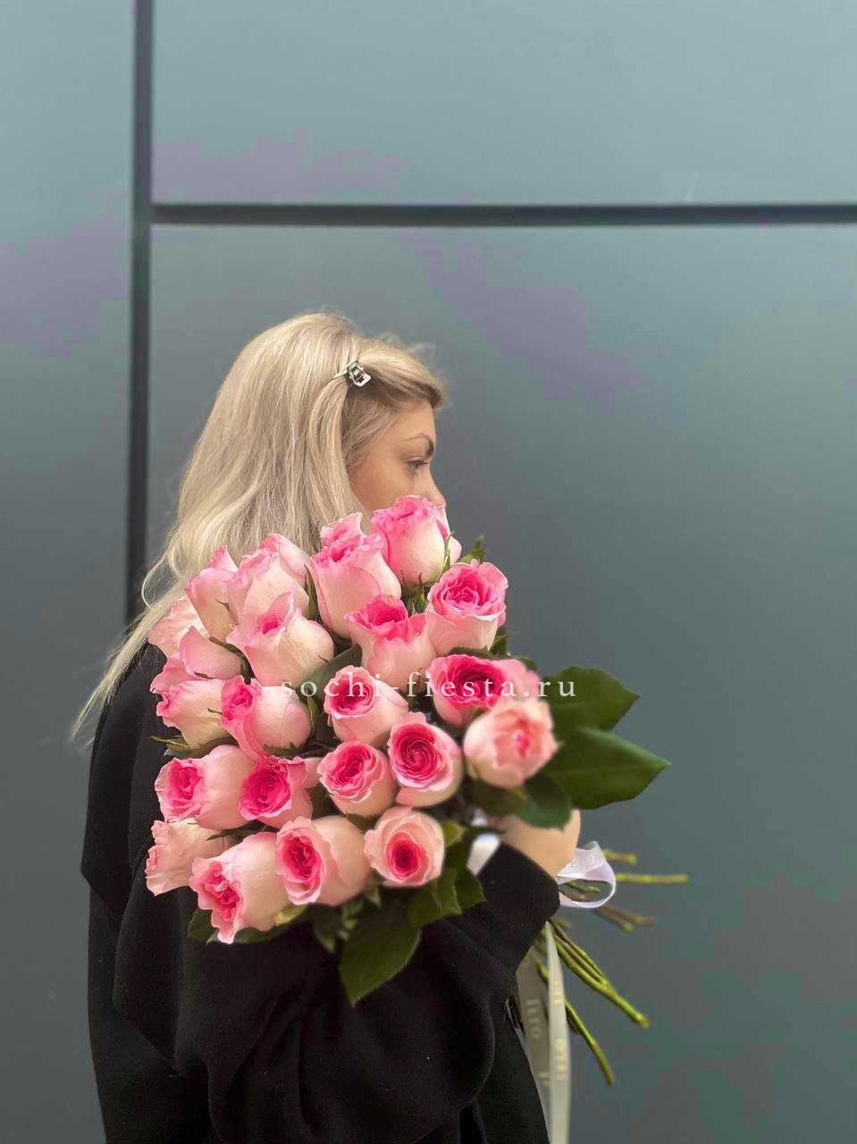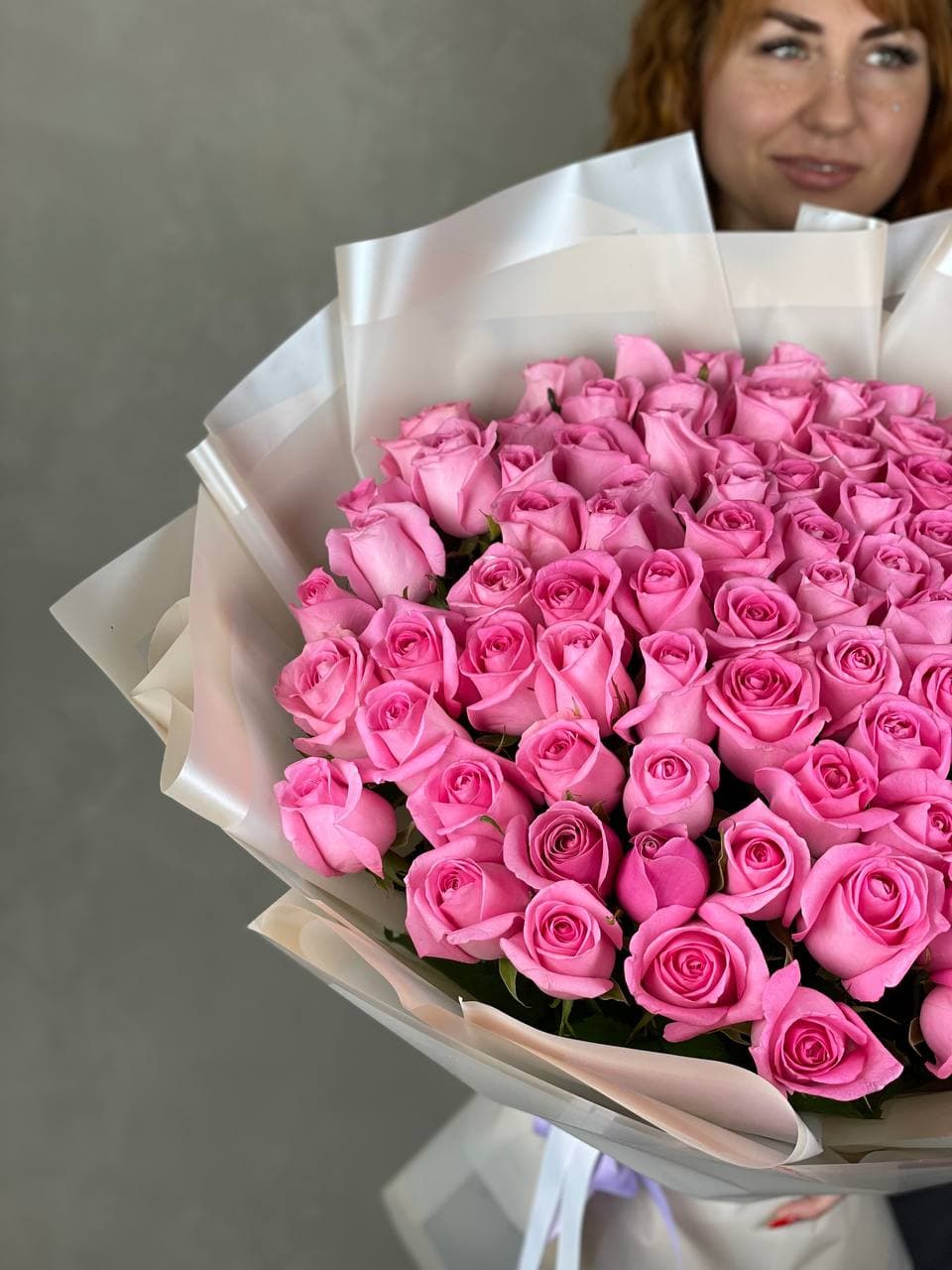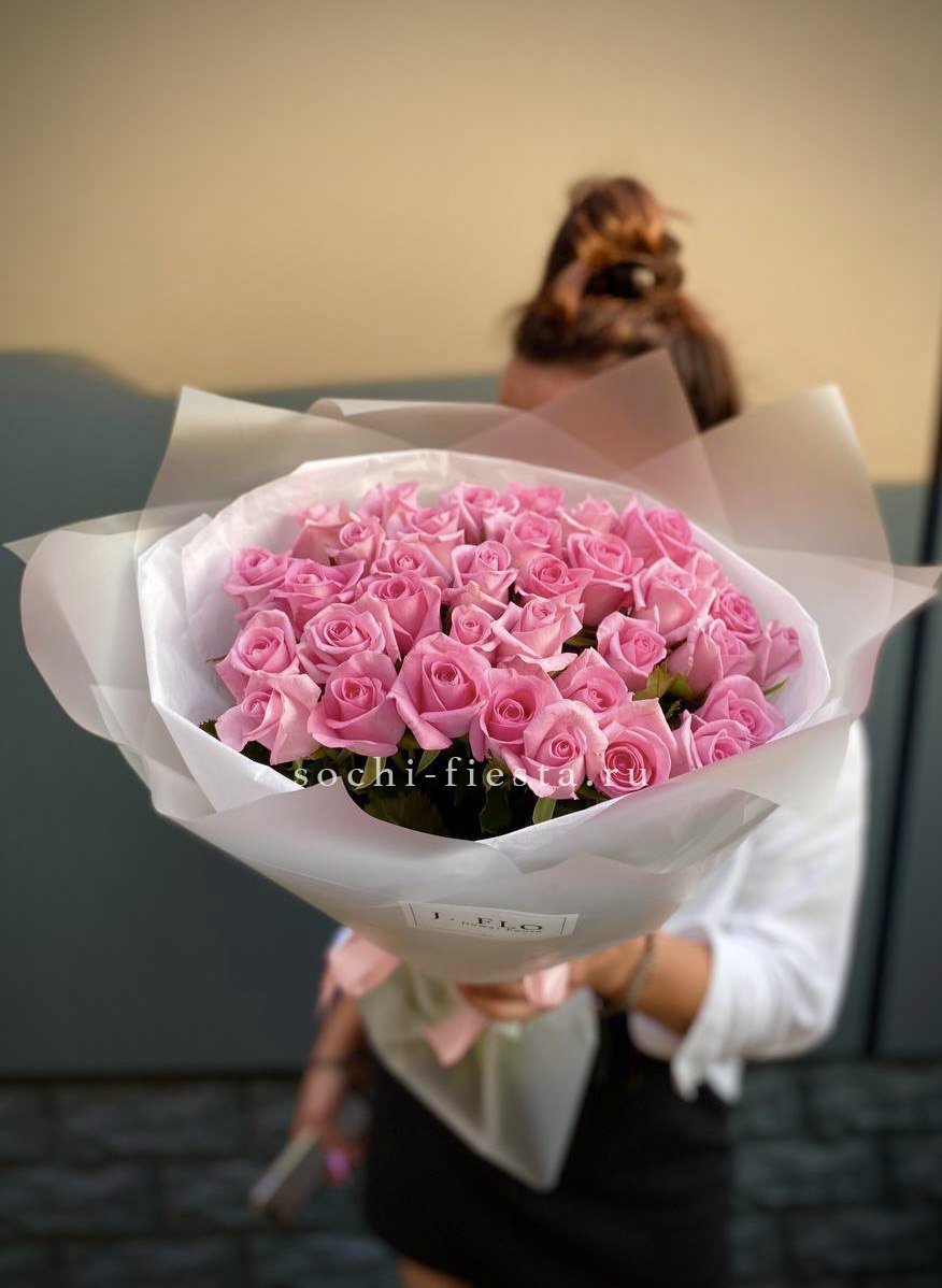 Тридцать одна роза образует пышное облако розового цвета с серебристыми нотами эвкалипта. Крафтовая обертка подчёркивает естественную красоту бутонов и создаёт ощущение лёгкости.