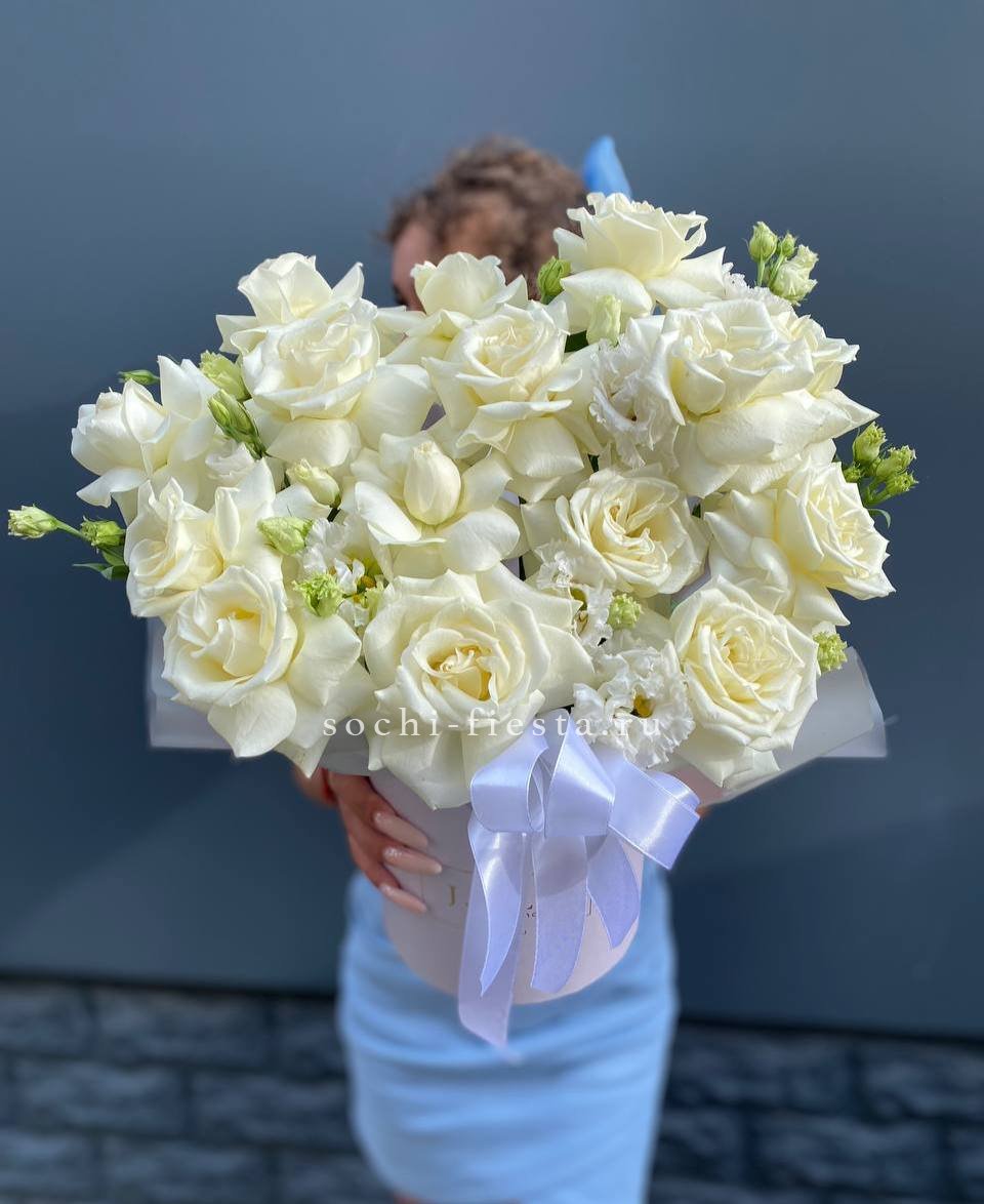 Тринадцать вывернутых французских роз сочетаются с серебристым эвкалиптом. Белые головки с волнистыми лепестками образуют воздушное облако.