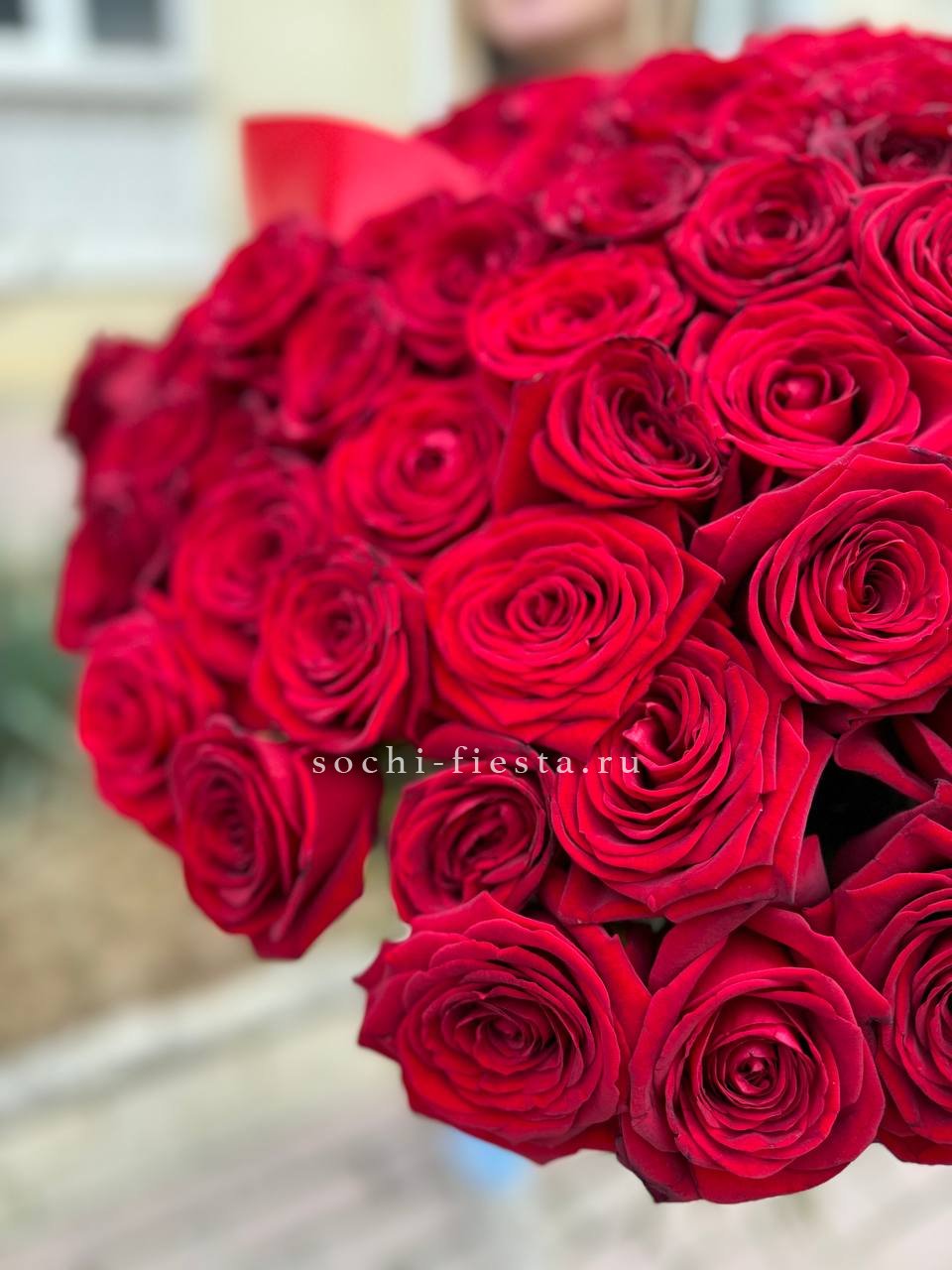101 красная голландская роза (фридом или эксплорер), лента, упаковка на выбор.