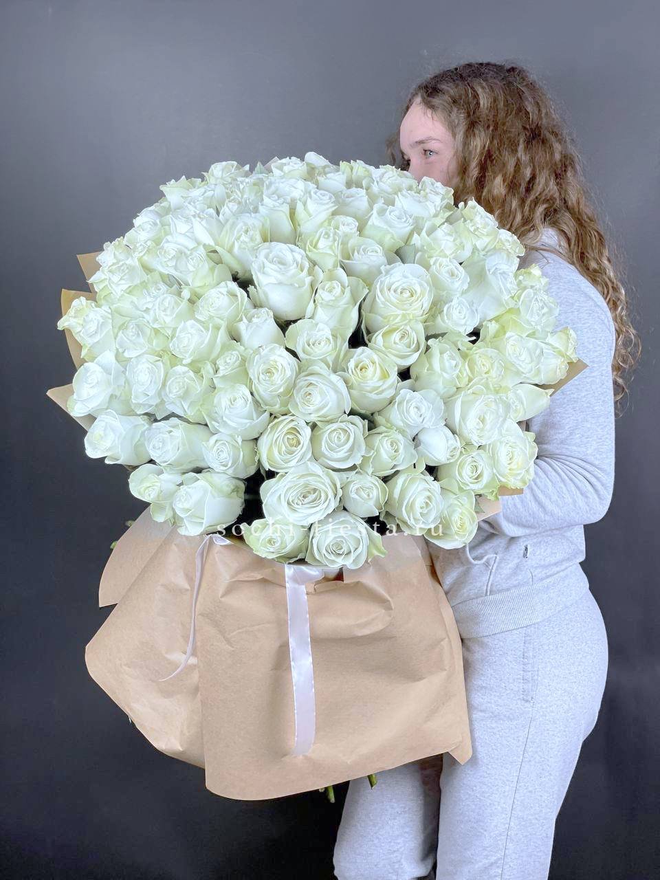 Пятьдесят один белоснежный бутон создаёт объёмное облако с мягкими переходами света и тени. Голландские розы держат форму и заполняют пространство плотной текстурой лепестков.