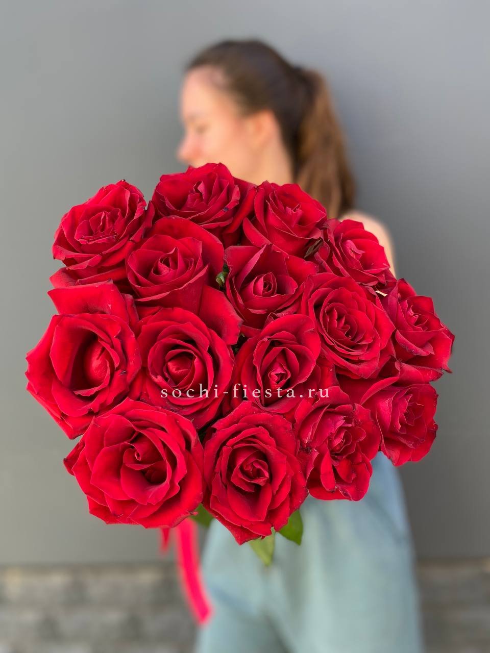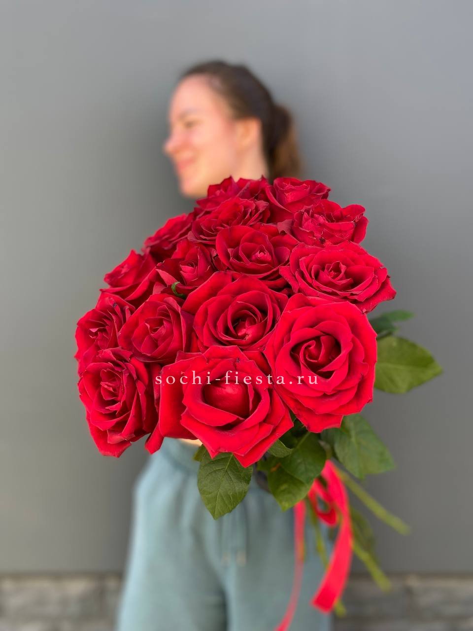15 красных высоких роз, оформление.