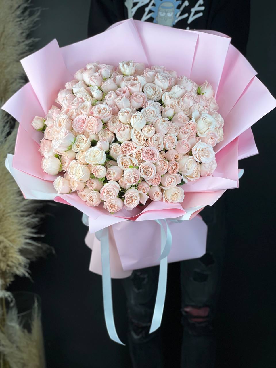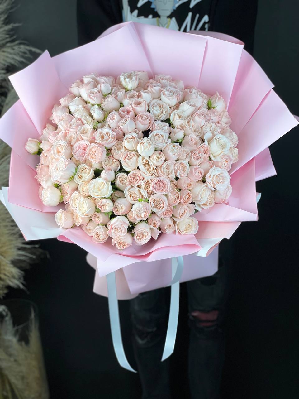 Сто одна кустовая роза Барбадос создаёт впечатляющий объём и визуальную мощь. Множество бутонов формируют плотную структуру с выразительным силуэтом. Композиция наполняет пространство и приковывает взгляд.
