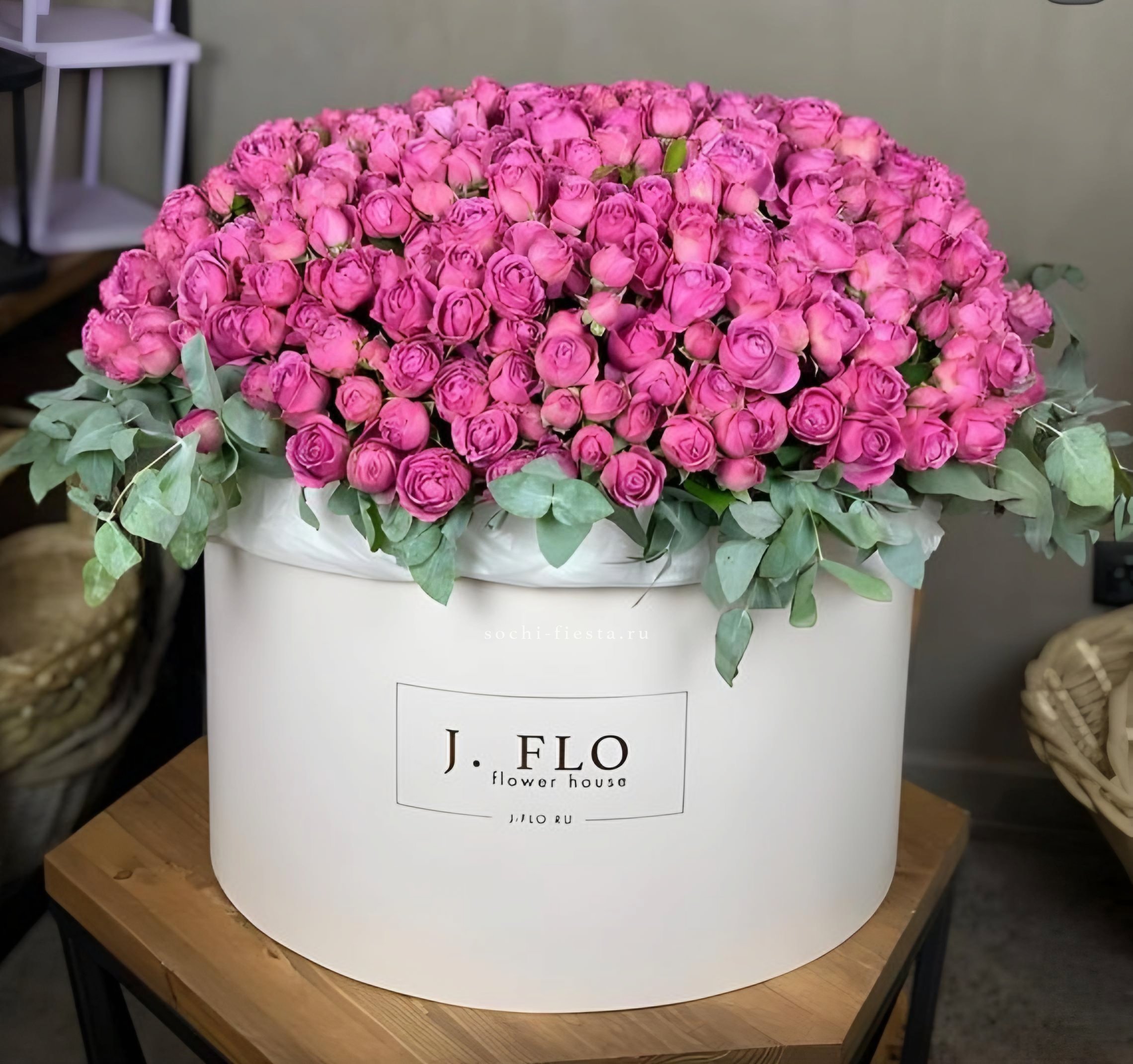 Пятьдесят пять роз двух сортов образуют монументальную композицию с выраженным присутствием в пространстве. Крупные бутоны создают плотную текстуру и заполняют объём без пустот. Впечатление масштаба и продуманной гармонии.