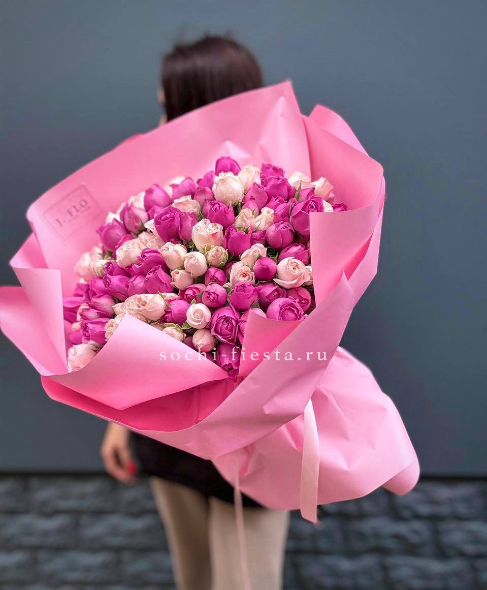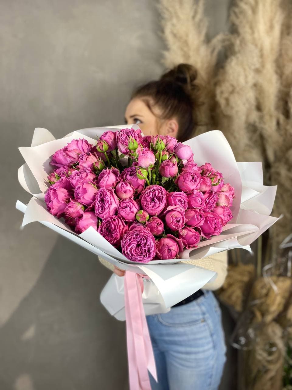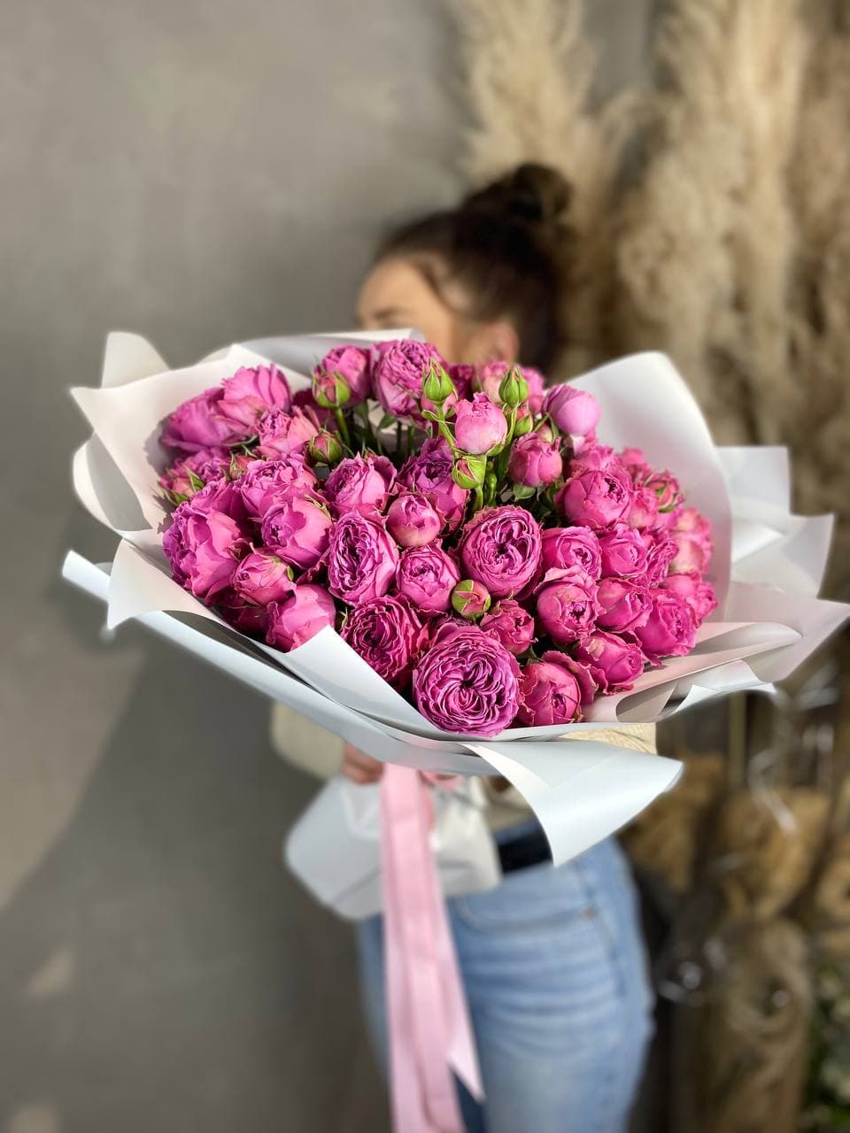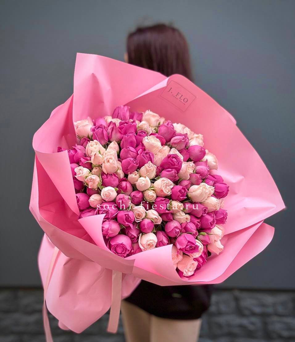 101 пионовидная кустовая кустовая роза Мисти Баблс, лента, дизайнерская упаковка.