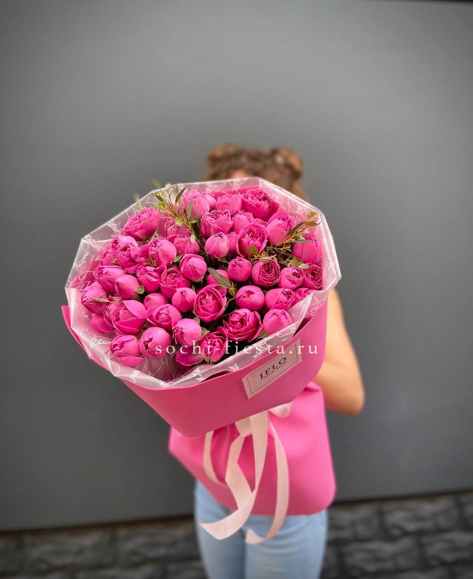 пионовидные розы кустовые мисти баблс в малиновом оформлении.