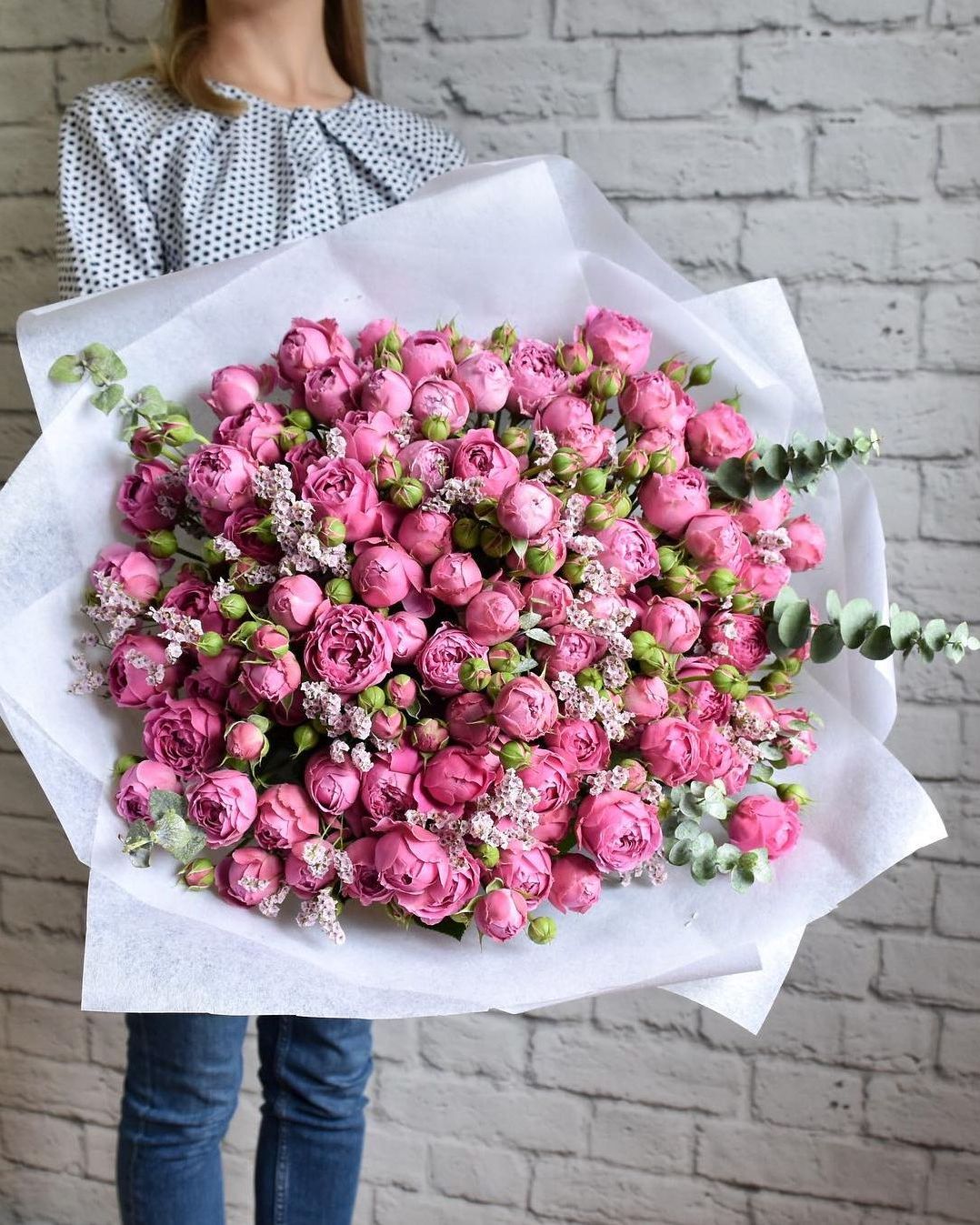 пионовидная кустовая роза Мисти Баблс - 51 шт., эвкалипт 5 шт., хаммелациум (или аналог), лента, дизайнерская упаковка.
