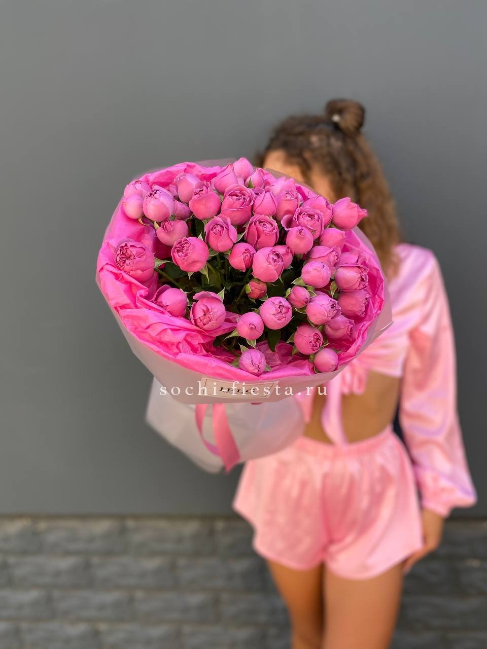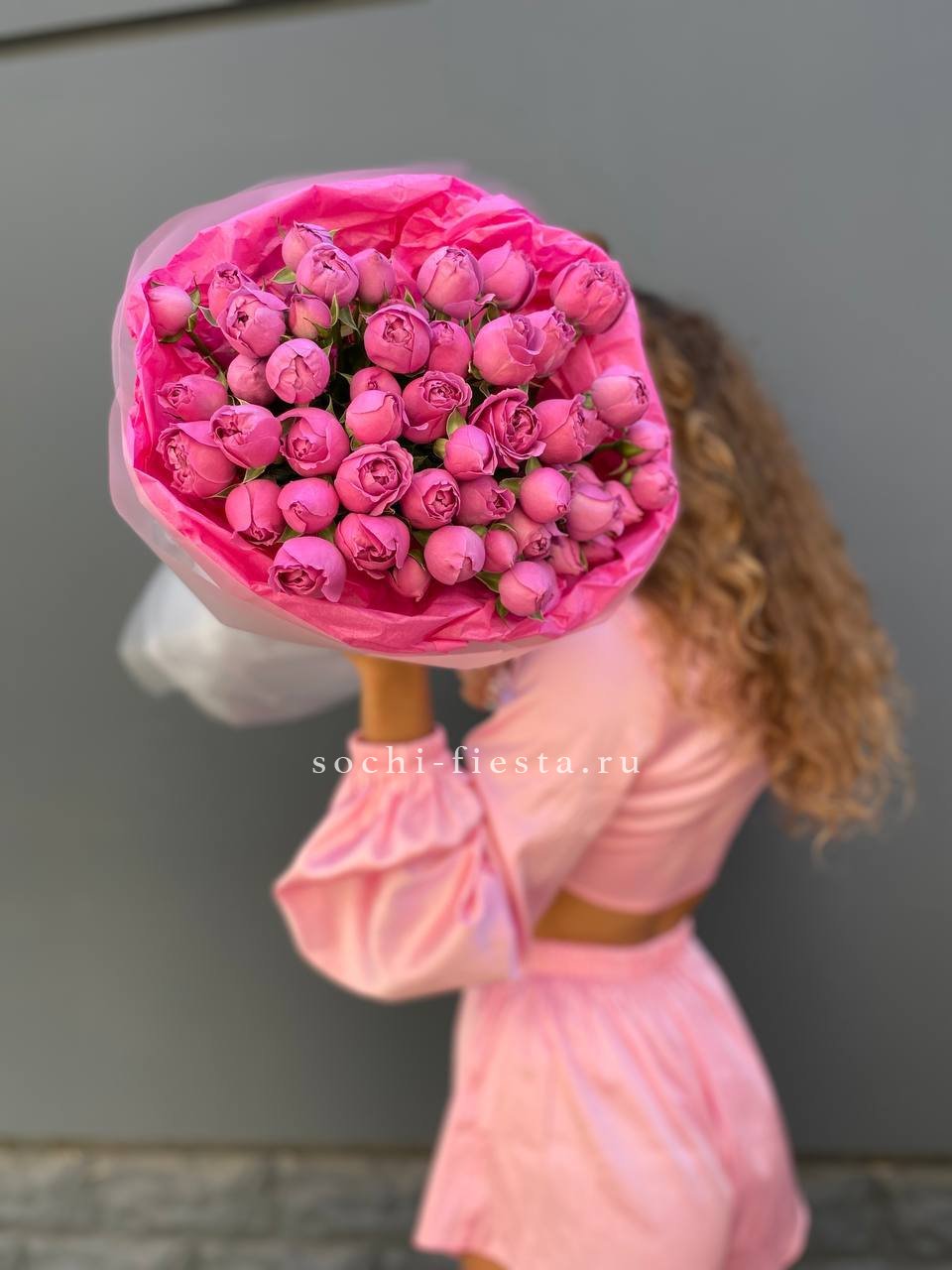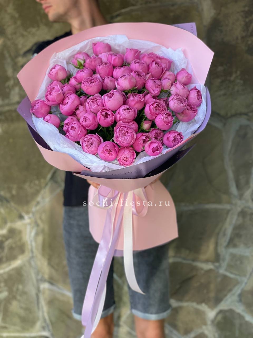 Пятьдесят одна ветка пионовидных кустовых роз Мисти Баблс дополнена эвкалиптом и хаммелациумом. Многослойные бутоны раскрываются пышными шапками в лавандово-розовой гамме. Воздушная зелень добавляет движение и свежесть всей композиции.