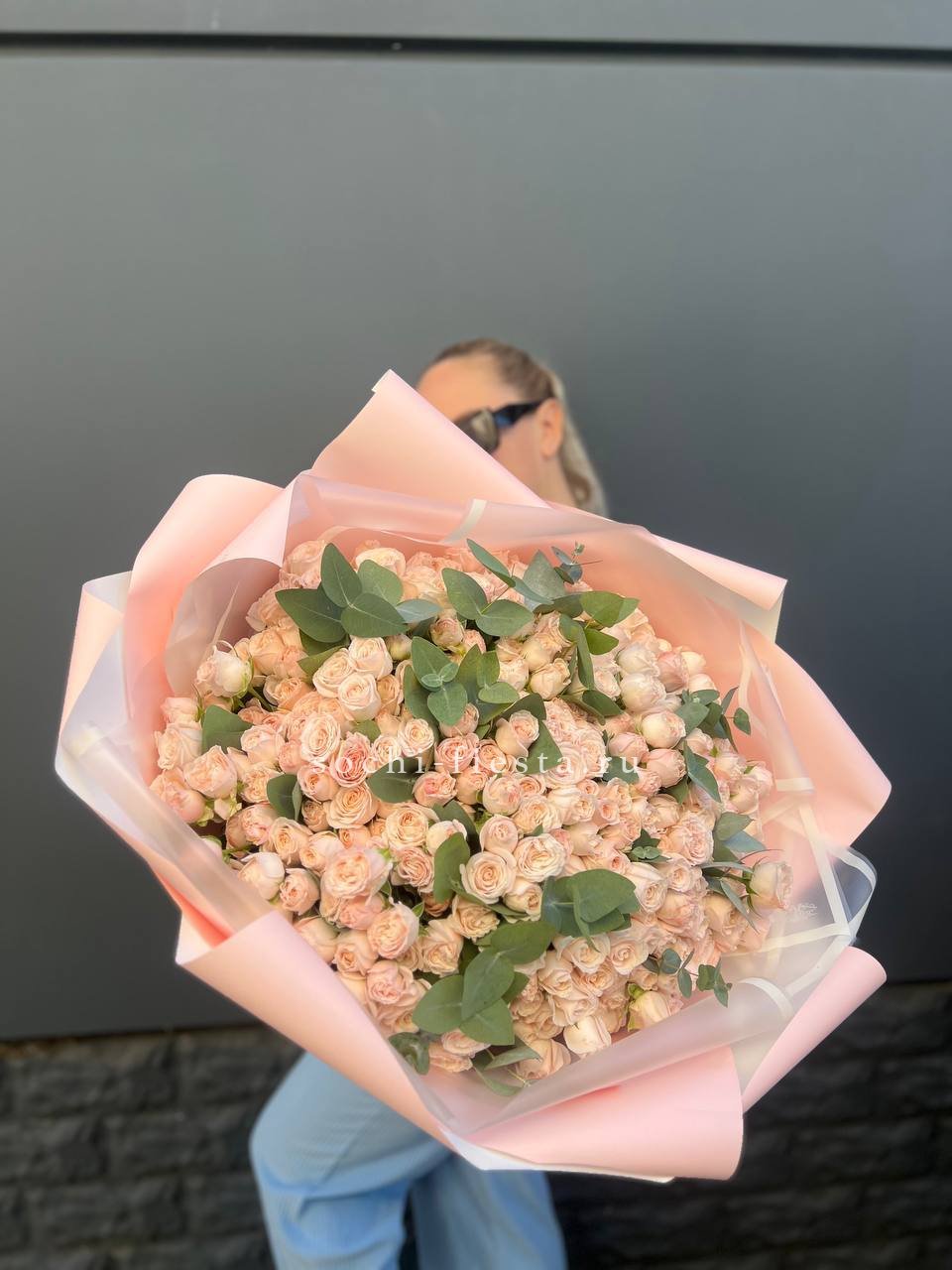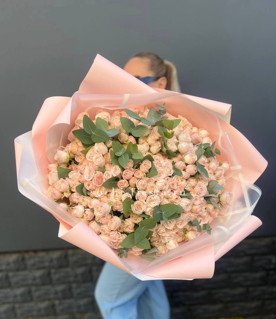 Пятнадцать кустовых роз собраны в плотную округлую форму. Мелкие бутоны создают воздушную текстуру и мягкий объём в пространстве.
