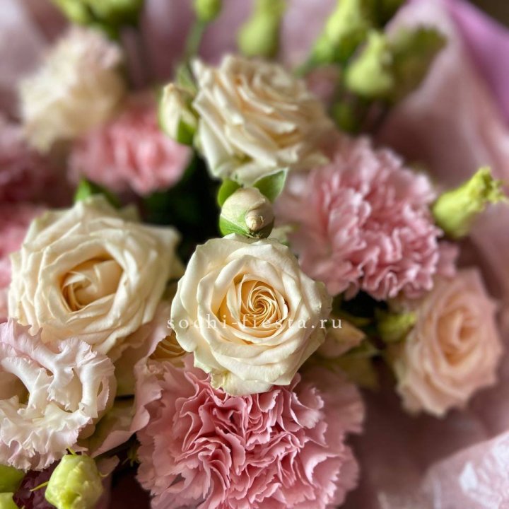 Основа сборных букетов в Твери: розы (Freedom, Mondial, Avalanche), хризантема кустовая, альстромерия, эустома, фрезия, вероника. Дополнительно — ранункулюсы в сезон, хризантема одиночная, ирис весной, тюльпаны в апреле. Состав зависит от текущей поставки и сезона. Флорист всегда предлагает то, что в лучшей форме прямо сейчас.
