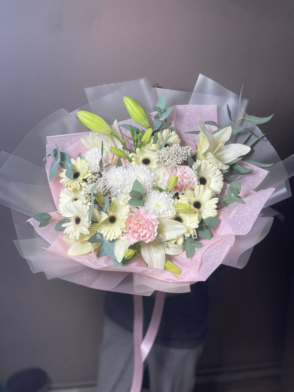 Воздушная композиция в кремовых и белых тонах собрана из нескольких видов цветов с разной формой бутонов. Эустома и диантусы создают мягкую текстуру, а кустовые розы добавляют объём и завершённость силуэту.
