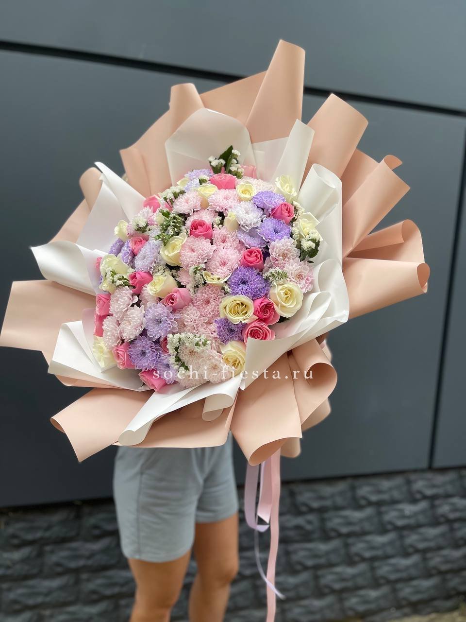 Авторская работа с плотным наполнением и выразительной палитрой. Розы и хризантемы образуют многослойную структуру, где каждый бутон раскрывается в своём ритме.