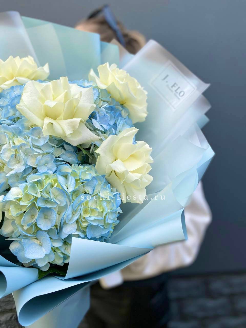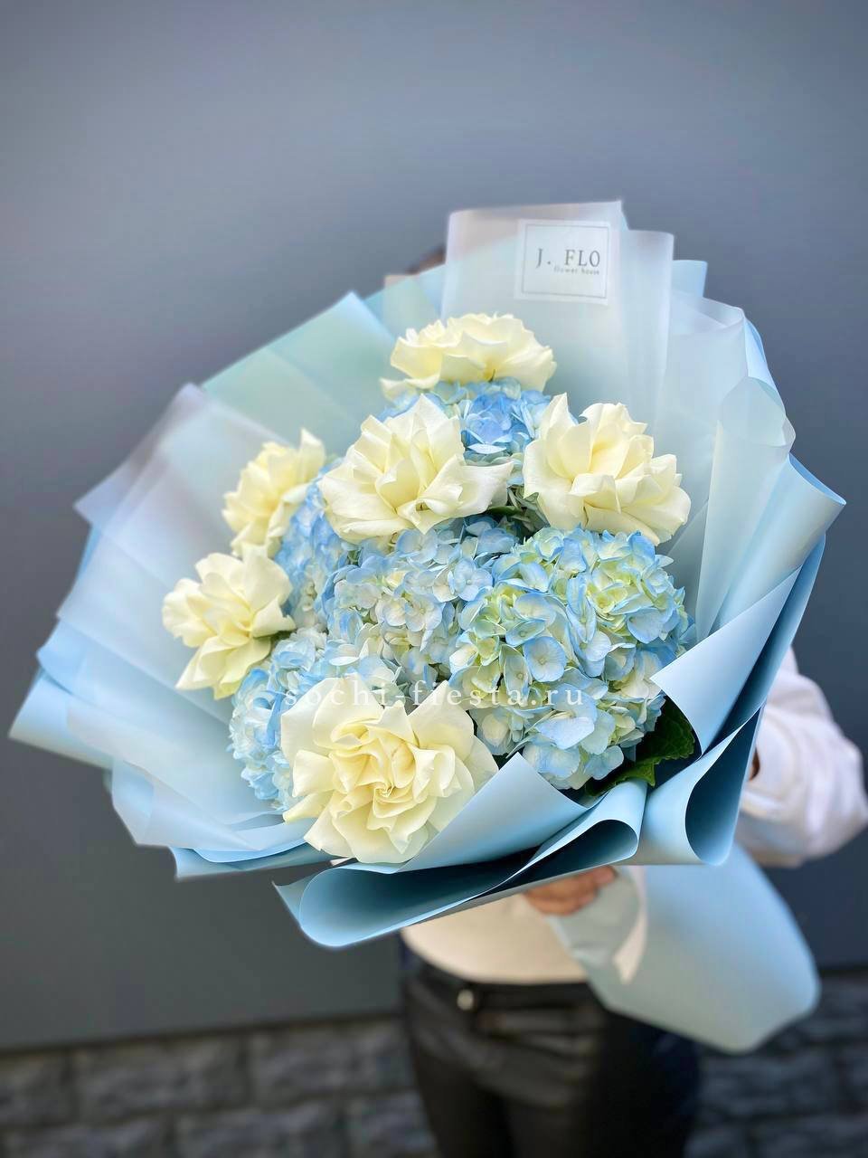 Плотная сборка с пышными соцветиями гортензии и яркими герберами создает объемный силуэт. Маттиола и лимониум добавляют воздушности по краям, а диантусы заполняют центр мягкими переходами.