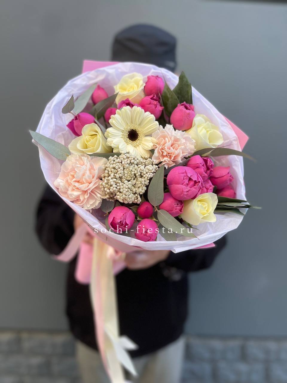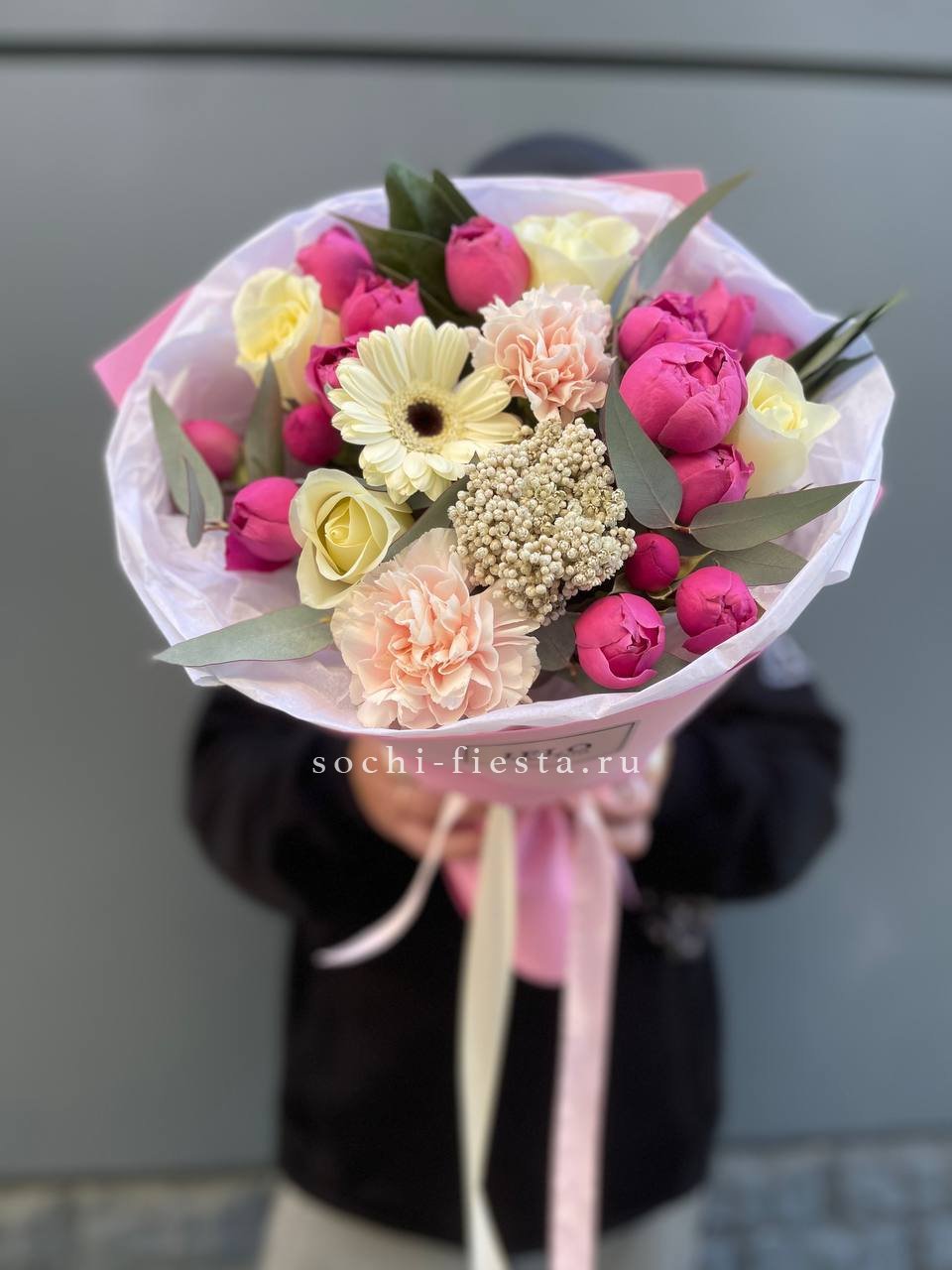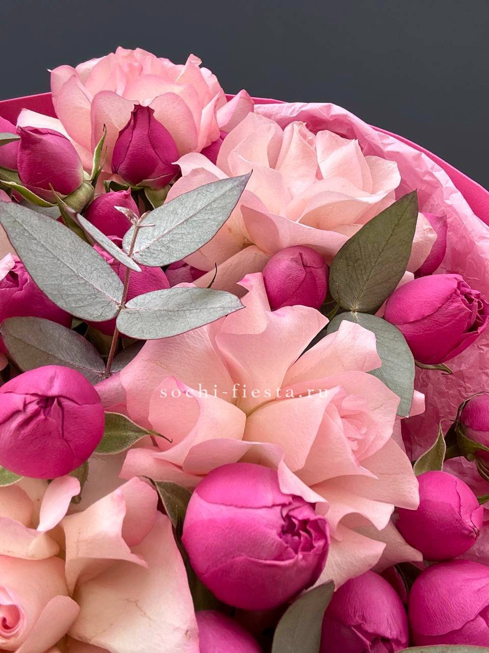 диантус, бомбастик, белые розы, эвкалипт, эустома, упаковка.