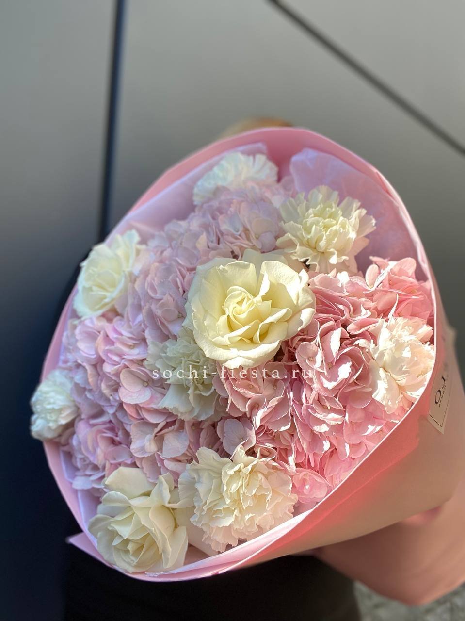 гортензия, роза белая, диантус лента, дизайнерская пленка.