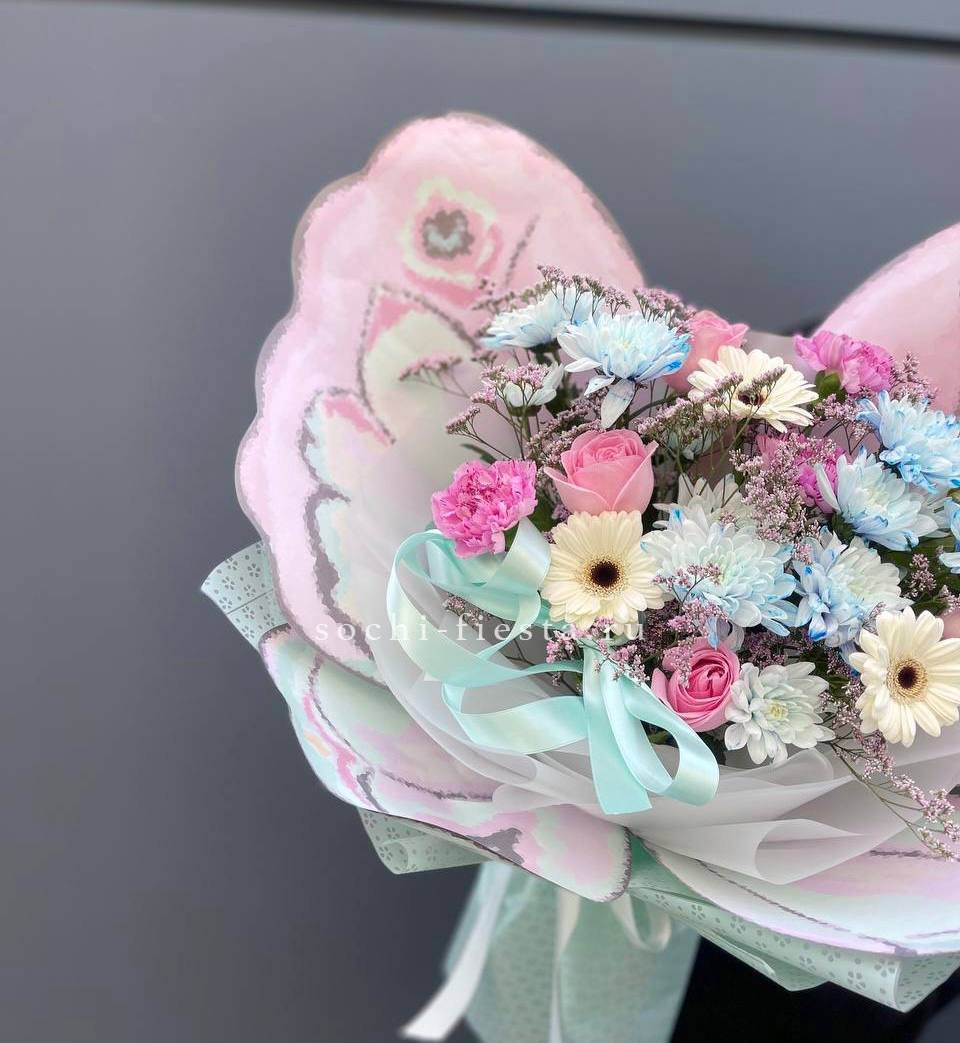 Воздушная композиция собирает кустовую хризантему, эустому и диантус в единый ритм. Озотамус и эвкалипт задают структуру, сохраняя свежесть надолго.