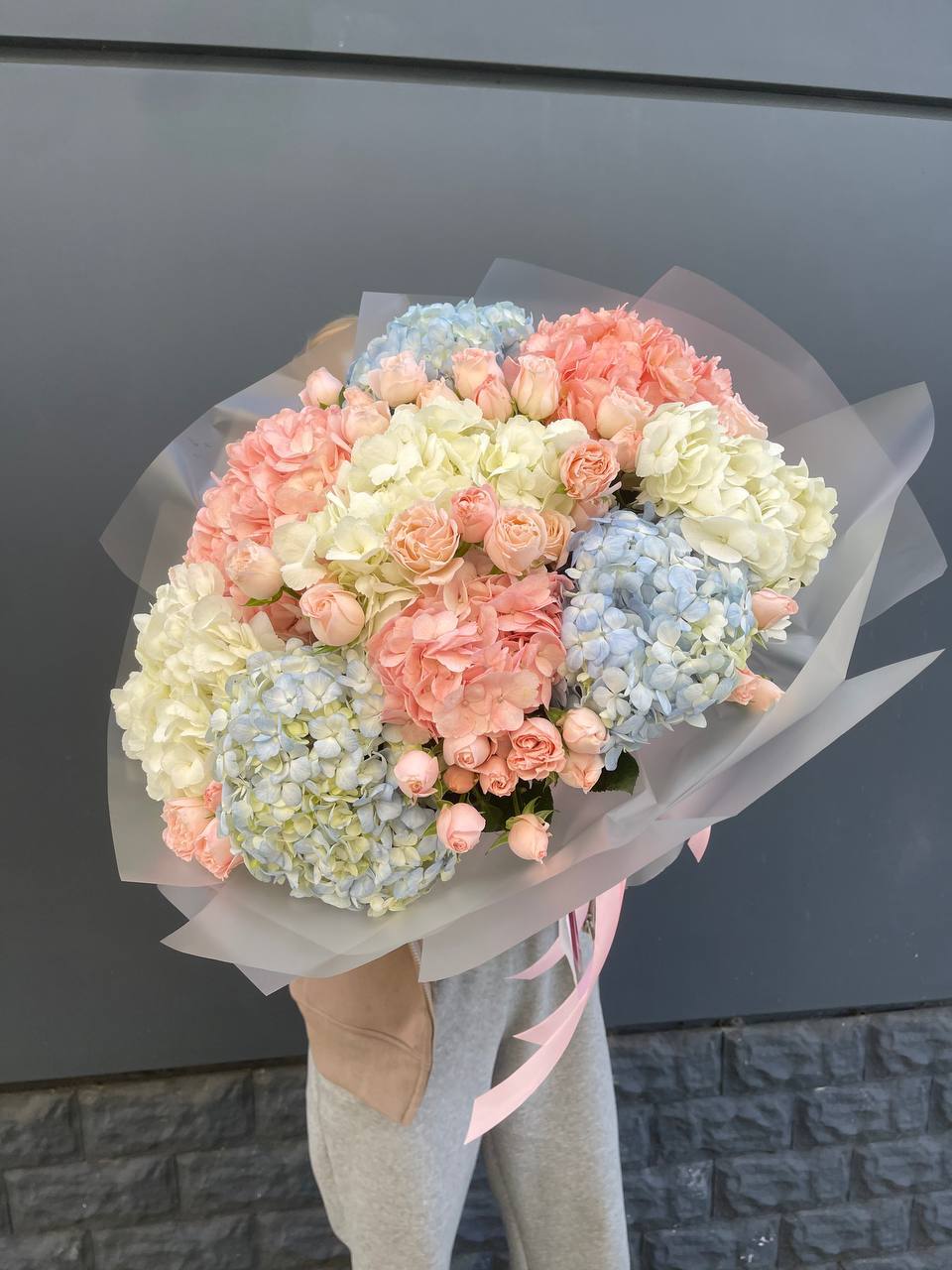 Пионы и эустома собраны в плотную округлую форму с выразительной текстурой лепестков. Белые и розовые оттенки создают мягкий переход без резких границ.