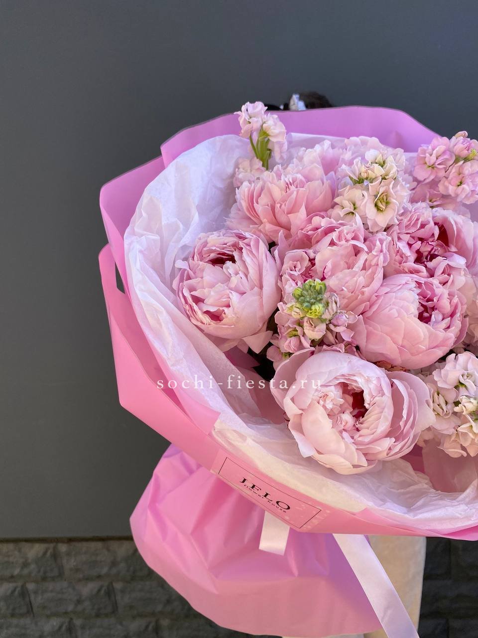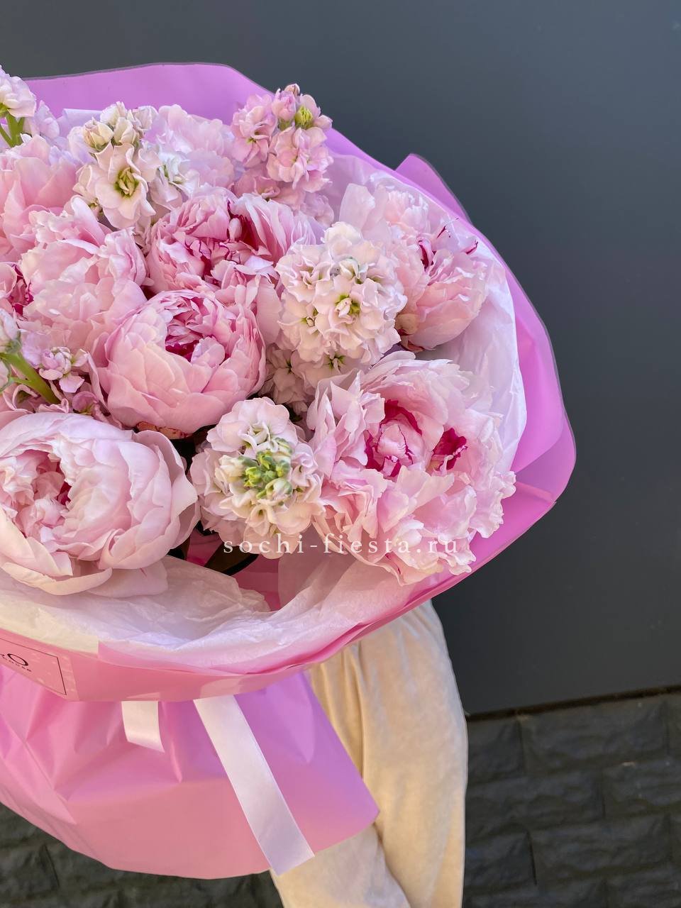 Пышные бутоны пионов с воздушной маттиолой собраны в композицию с мягкими линиями. Тишью и лента завершают образ, добавляя лёгкости и объёма.
