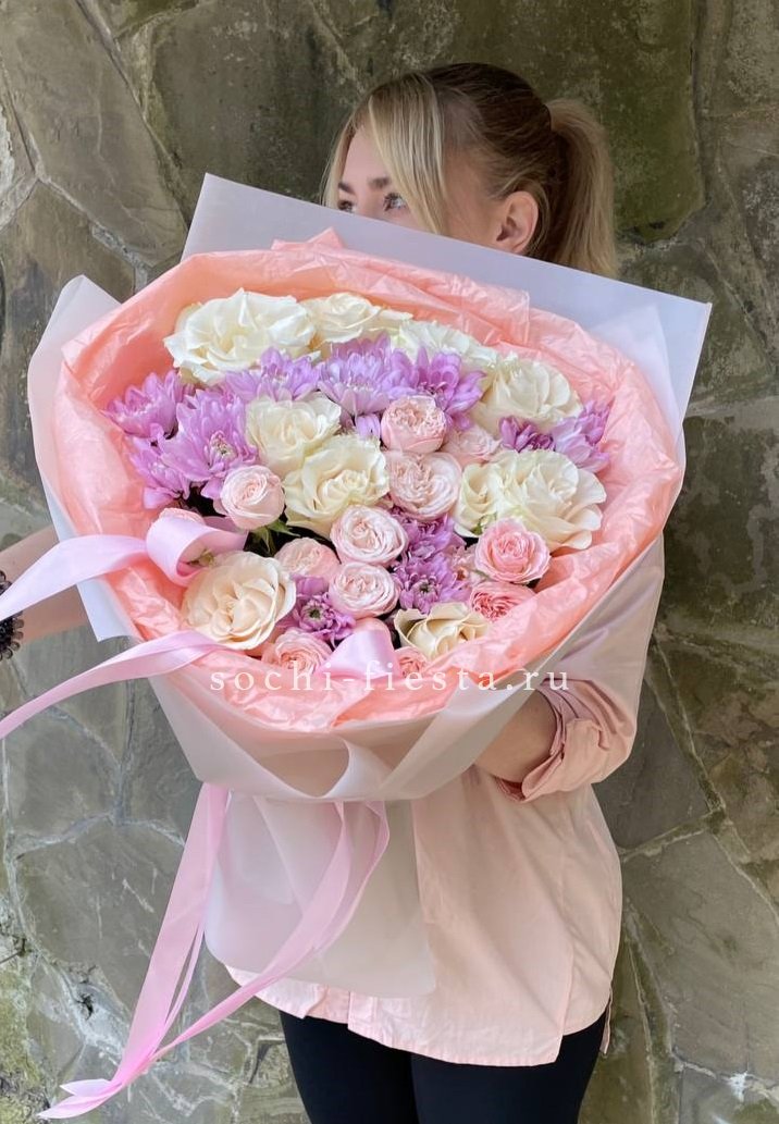 Воздушные соцветия лагуруса создают мягкую дымку вокруг роз и хризантем. Букет собран с ощущением лёгкости и простора, словно морской бриз коснулся каждого лепестка.