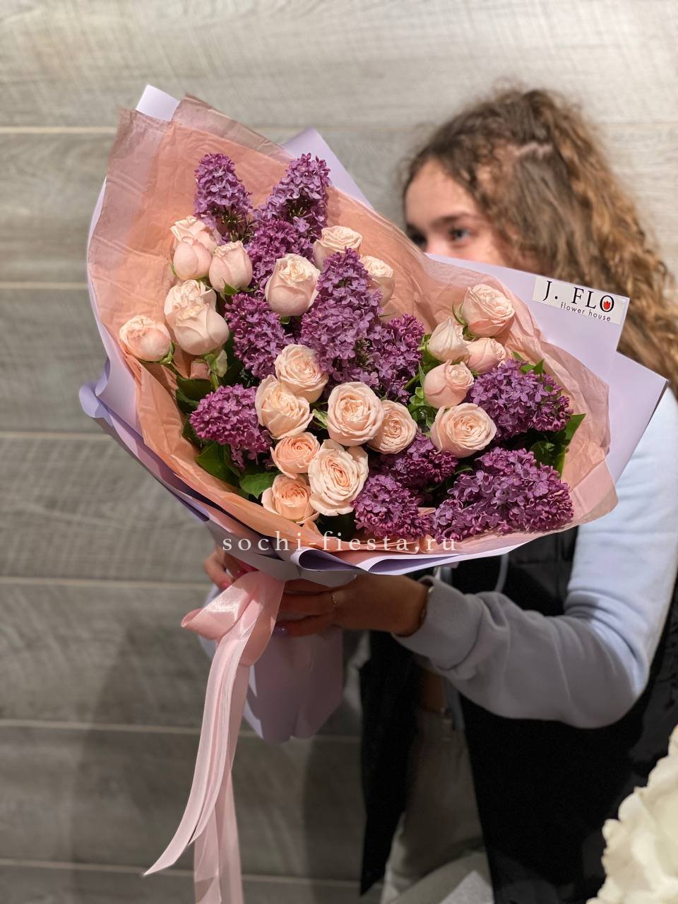 Сирень обвивает пышные бутоны пионовидных роз и задает мягкий лиловый ритм всей композиции. Букет дышит весной и заполняет пространство ароматом. Форма свободная, но собранная.
