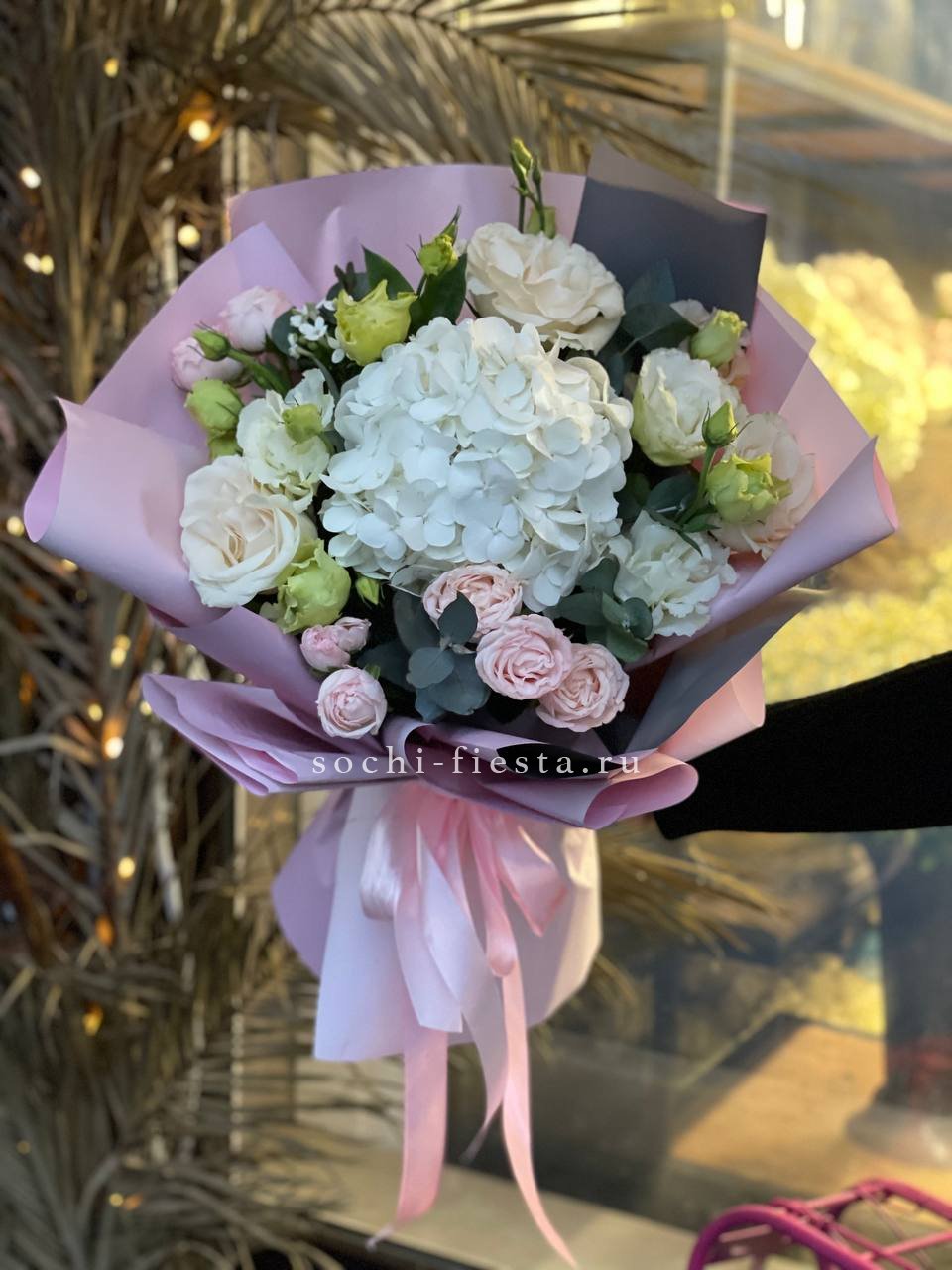 гортензии, хризантемы, лента и дизайнерская пленка.