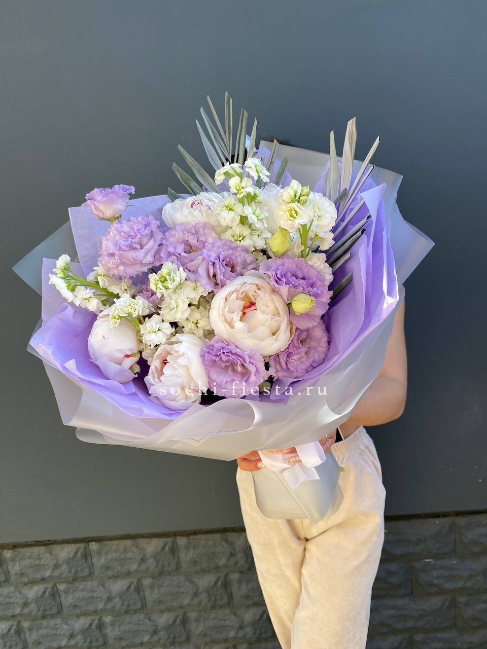 Пионы и эустома собраны в свободную форму где каждый бутон раскрывается в своём ритме. Маттиола и чико дополняют букет мягкими линиями и природной непринужденностью.