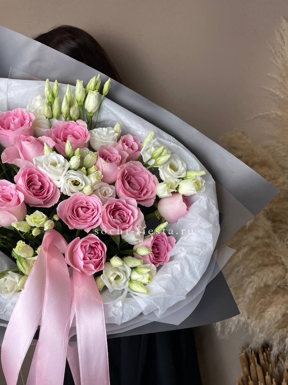 розы, пионовидные розы, эустома, диантусы, гортензия, эвкалипт, лента, фоамиран, тишью.