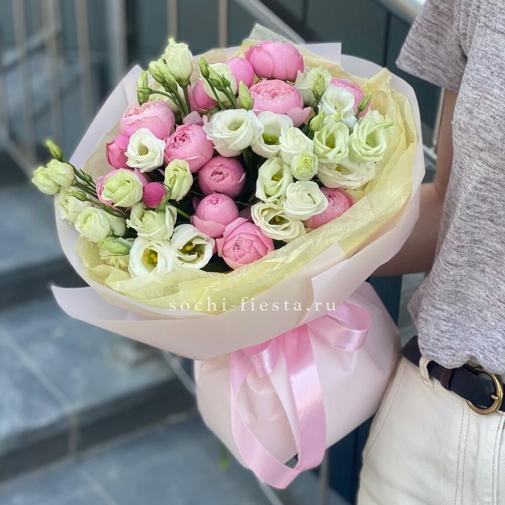 гортензия, диантус, кустовая пионовидная роза, эустома, вспомогательные цветы, эвкалипт, лента, дизайнерская упаковка.