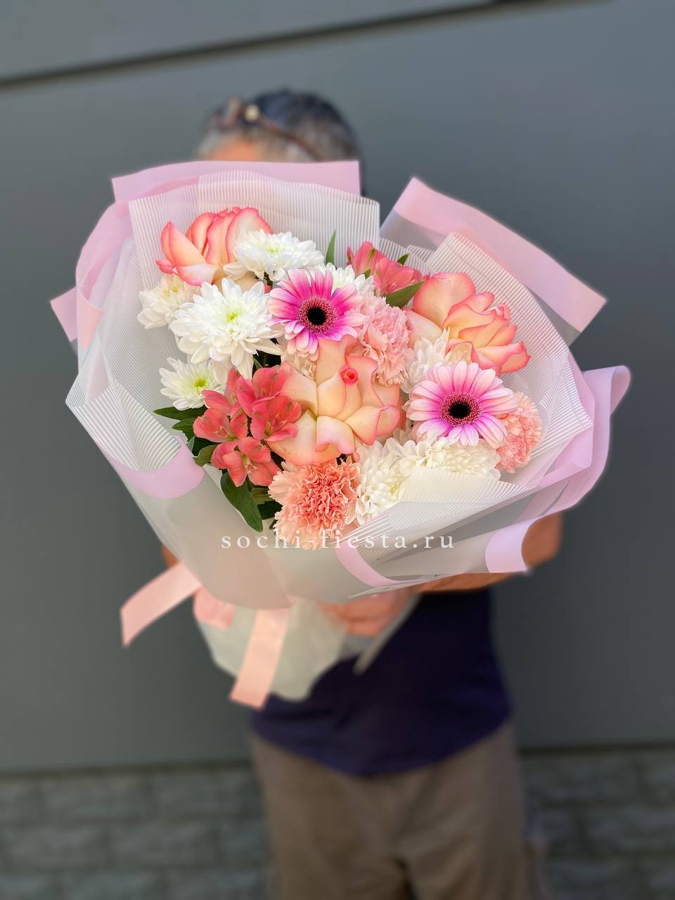 хризантема кустовая, гербера, роза французская, диантус, альстромерия, лента, дизайнерская пленка.
