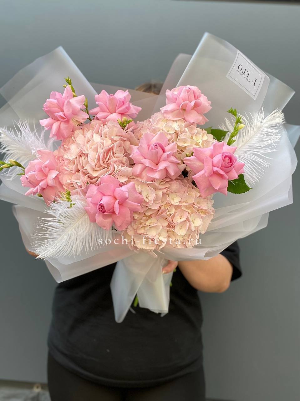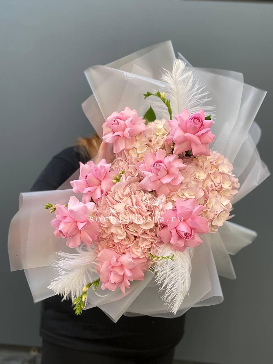 Пышная шапка из гортензии и пионовидных роз собрана с филигранной точностью. Диантус и эустома создают воздушные переходы между крупными соцветиями, а озотамнус добавляет графичные вертикали. Букет для тех, кто понимает язык авторской флористики.