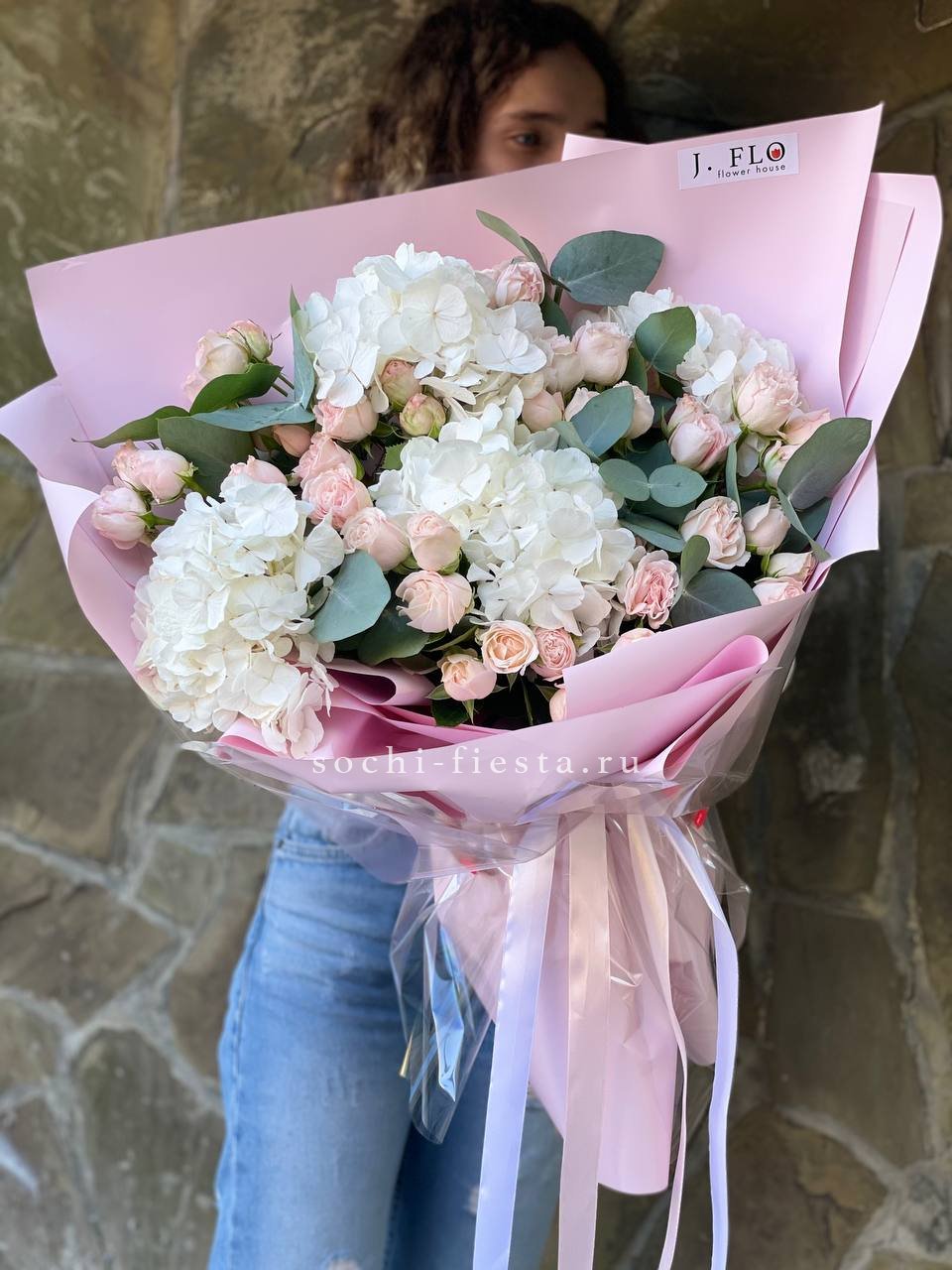 Воздушная композиция с белоснежной гортензией и пионовидными розами в окружении эвкалипта и пампасной травы. Светлая палитра и природная текстура создают ощущение летнего сада. Гармония форм и естественная свежесть в каждом элементе.