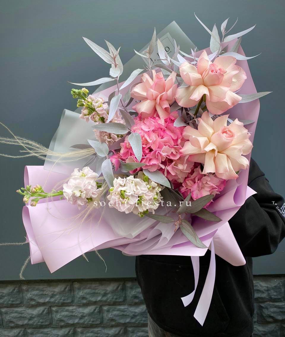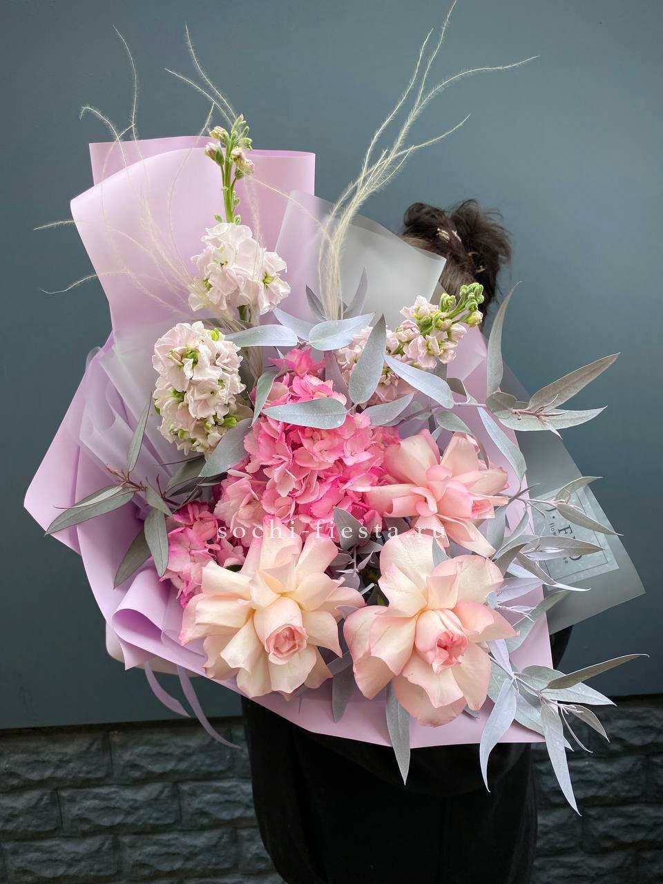 гортензия, пионовидные розы, пампасная трава (стифа), лента, дизайнерская упаковка.