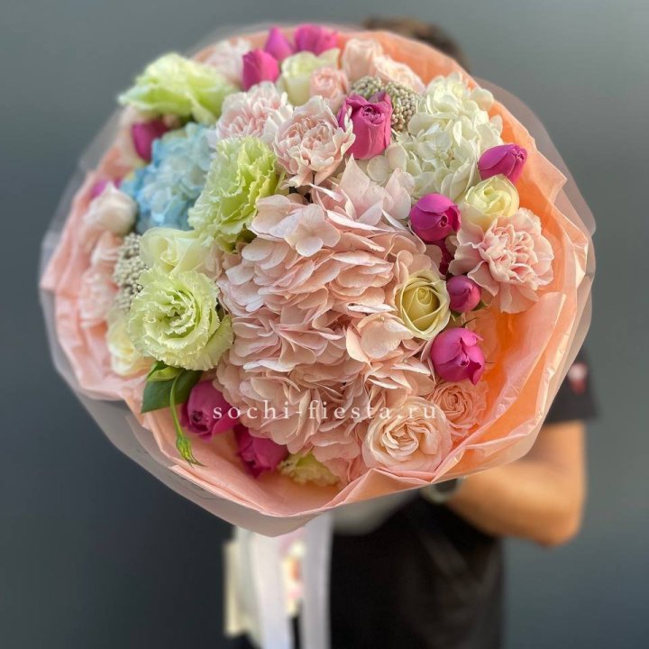 Сезонные хиты в Твери складываются из классической голландской и эквадорской срезки круглый год плюс сезонные акценты. Пионы в мае-июне, гортензия летом, хризантемы осенью, амариллис зимой. Местные тёплые теплицы добавляют свежие позиции в межсезонье.