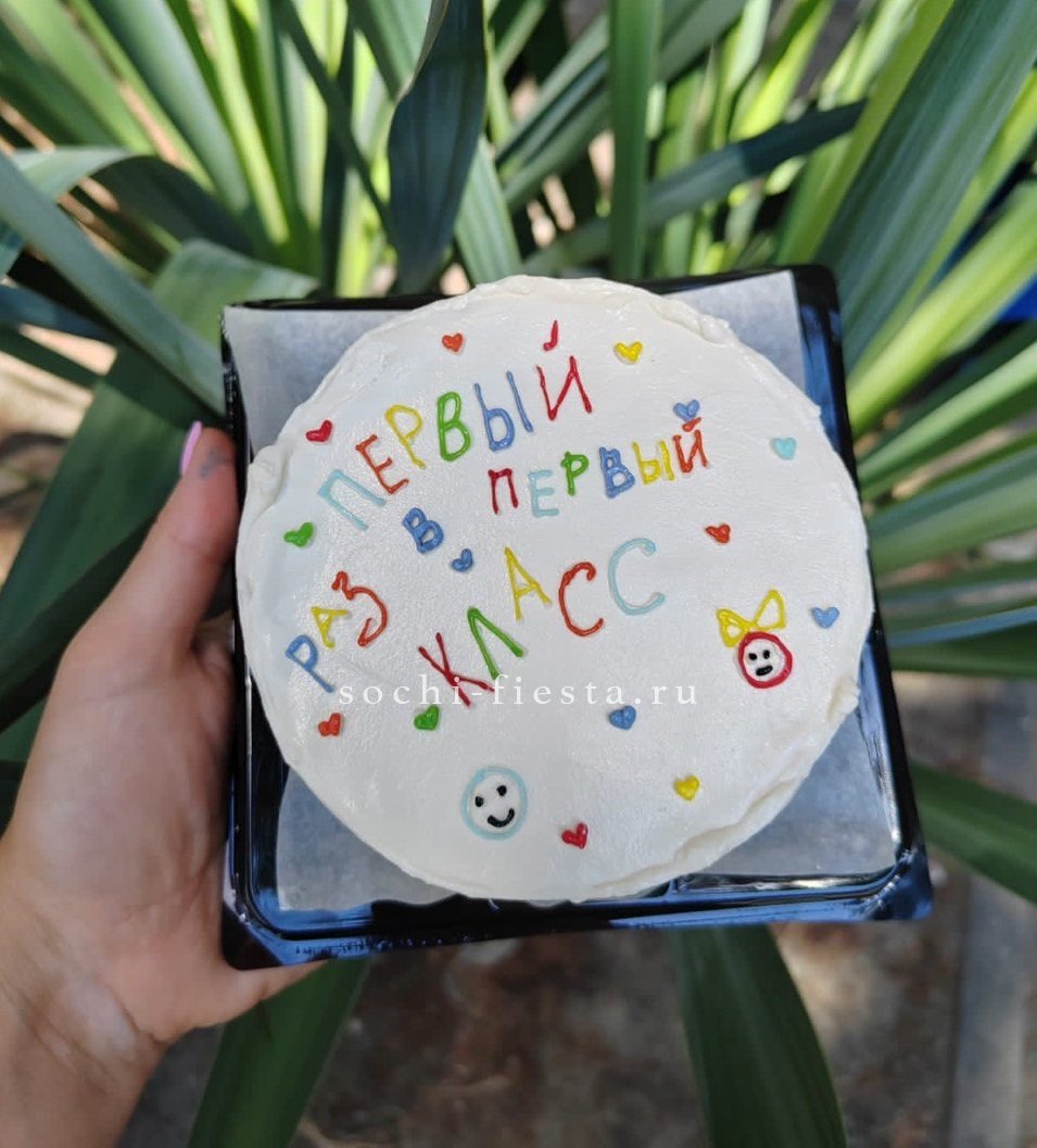 Торт с праздничным оформлением для первоклассника. Две начинки на выбор позволяют подобрать вкус под предпочтения ребенка.