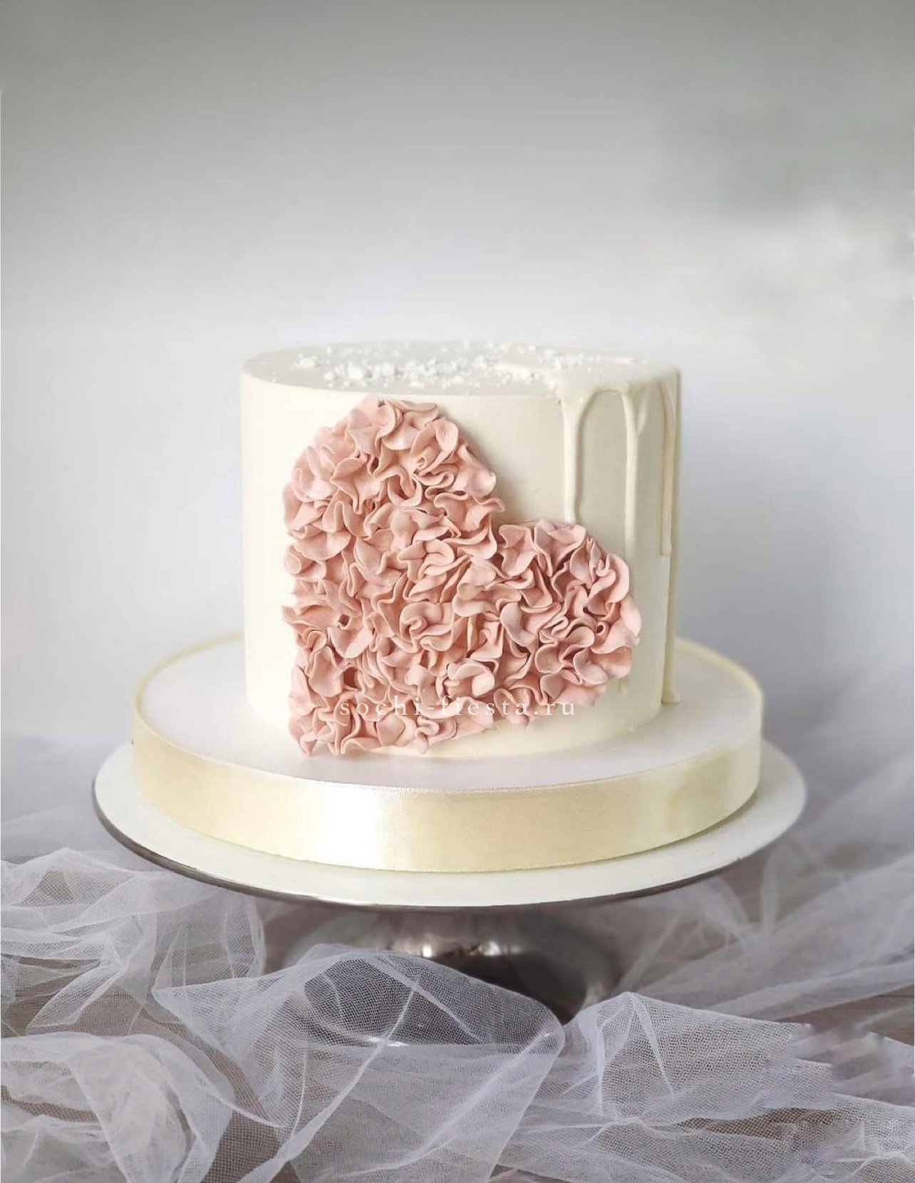 Классическая форма сердца выполнена в технике ручной работы с продуманным декором. Торт выглядит цельно и завершенно благодаря четкой геометрии и выверенным пропорциям.